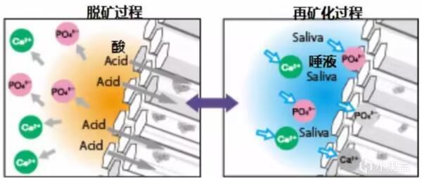 但是我们的口腔防御机制也有一定的自我纠错和修复功能。牙齿长期浸泡在唾液里,唾液中含有大量的钙磷离子(且往往浓度高于牙面),可以随时往牙面上沉积,重新形成新的羟基磷灰石,弥补之前脱矿造成的钙磷损失,形成动态平衡。