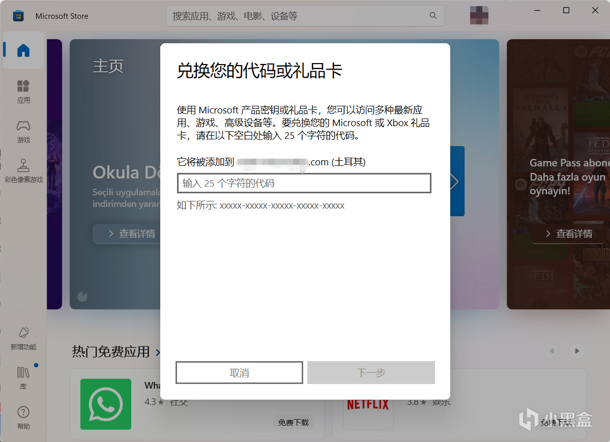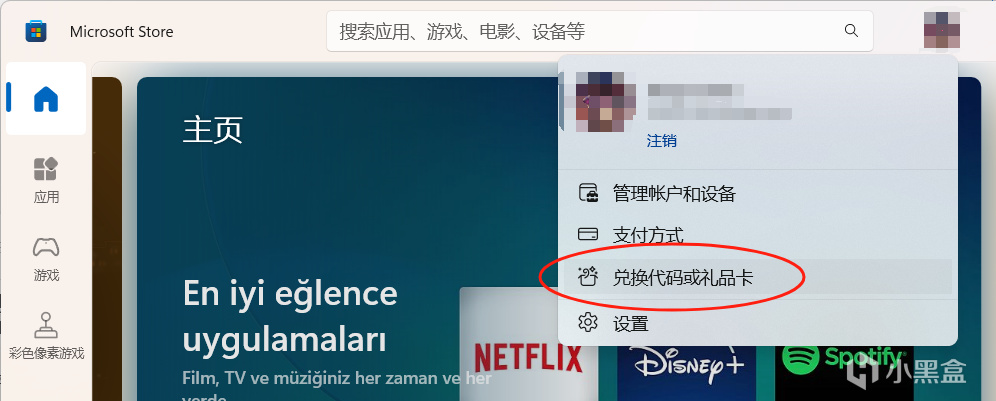 3.打開電腦上的微軟商店(Microsoft Store,一般可以在開始界面找到),此時裏面的很多內容都變成了土耳其語,點開頭像,選擇兌換代碼或禮品卡,輸入購買的代碼進行兌換。