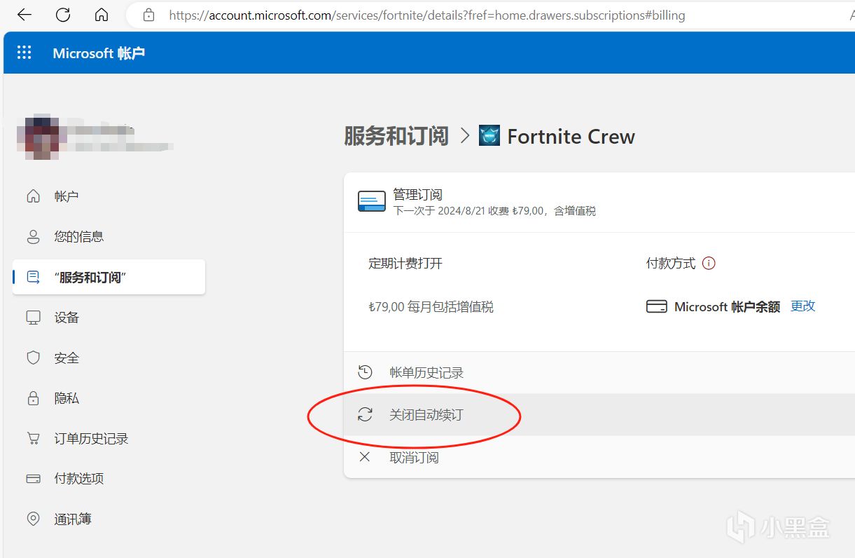 4.如果你只是想要戰鬥通行證和皮膚,建議在微軟賬戶裏面的“服務和訂閱”裏關閉自動續訂。這樣有效期結束後就不會自動扣費,當然月卡也不會再提供1000V幣。(如果你在淘寶代購也務必提醒店家幫忙關自動續訂)