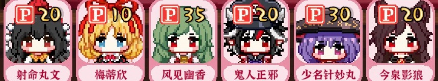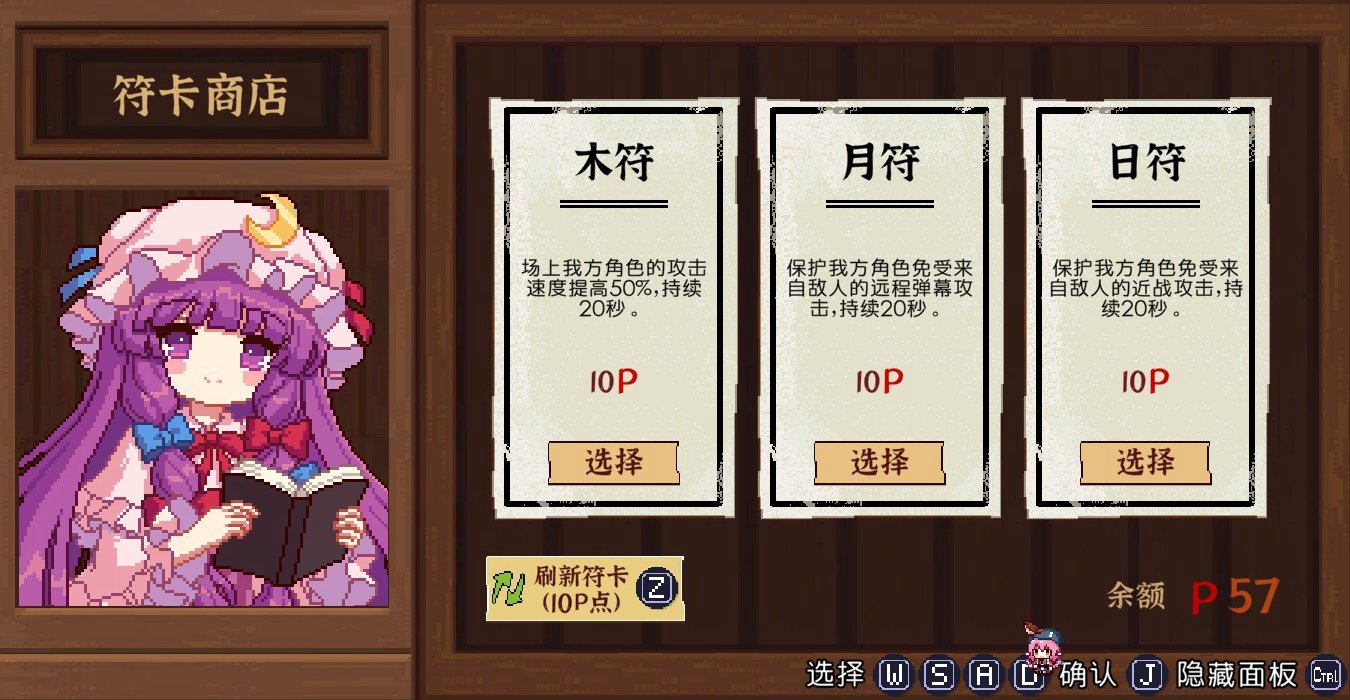 帕秋莉符卡,可以花費10P在帕秋莉購買三選一符卡,買完會進入冷卻,也可以花費10P刷新符卡。