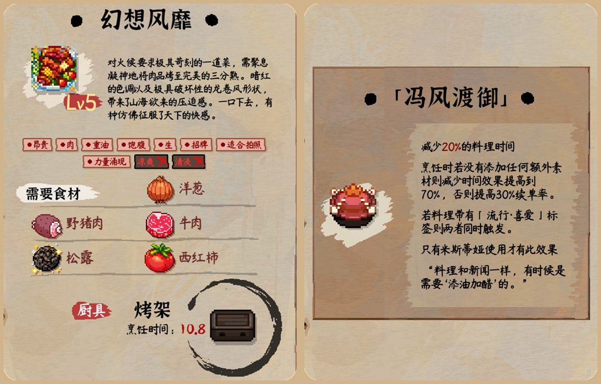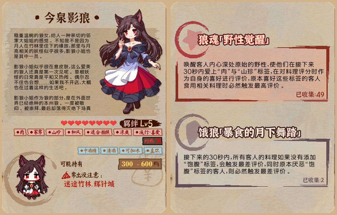 Lv.2:影狼食用帶有「肉」標籤的料理後會在10秒內獲得線性衰減的300%普通攻擊傷害加成。重複激活時重置持續時間。