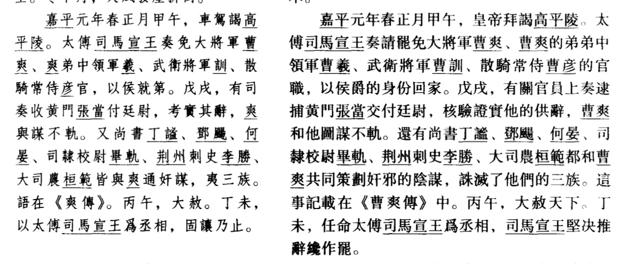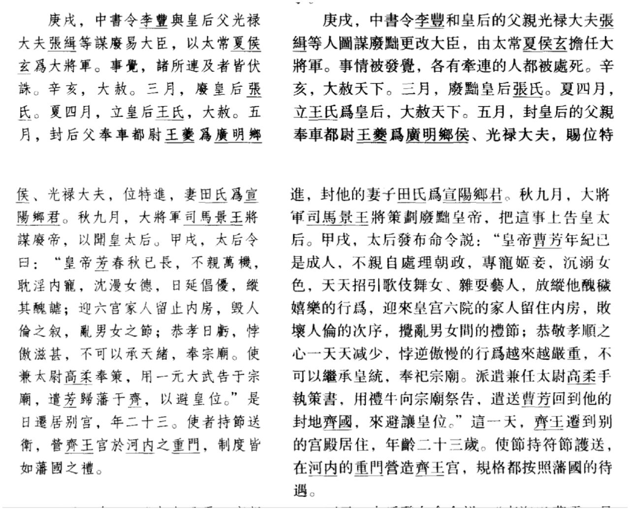 在高平陵之变之前曹爽在政治上可以说是一直压着司马懿一头的,甚至能把司马懿逼到去装病,很明显曹爽绝对不简单。而陈寿在这里把高平陵之变用一个“奏免”就盖过去了很明显是不合适的,毕竟你见谁奏免其他人之前要先“阴养三千死侍”还要先占领武库的(对于高平陵之变也放到以后和曹爽一起说)不管怎么说,通过高平陵之变司马懿完成了对才爽派系的全部斩杀,在这之后也进入了曹芳政治生活的最后阶段了。
