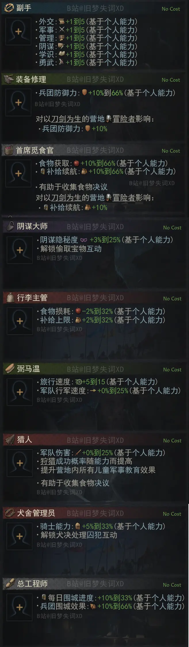 最后,我们还设计了一批提供部队加成的营地职位,这些职位都是为了弥补冒险者补给不足的缺点而在数值方面的补偿,而这些职位都需要试炼场建筑升级解锁。