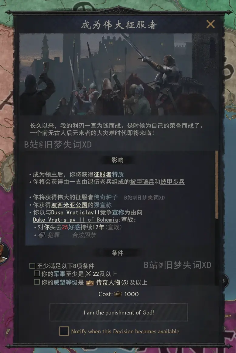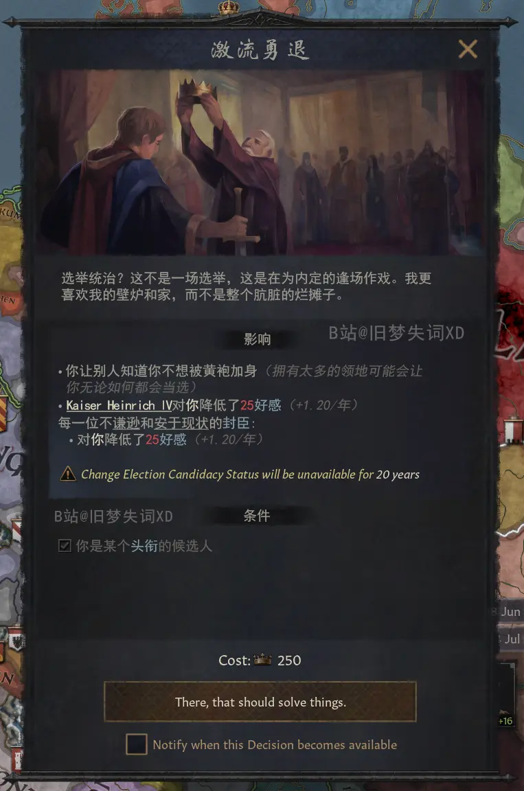 这样做会惹怒帝国内其他封臣。不过有些时候也不得不黄袍加身,你在帝国内的领地越大,其余封臣就越会强迫你上位,每次都给投你的票。