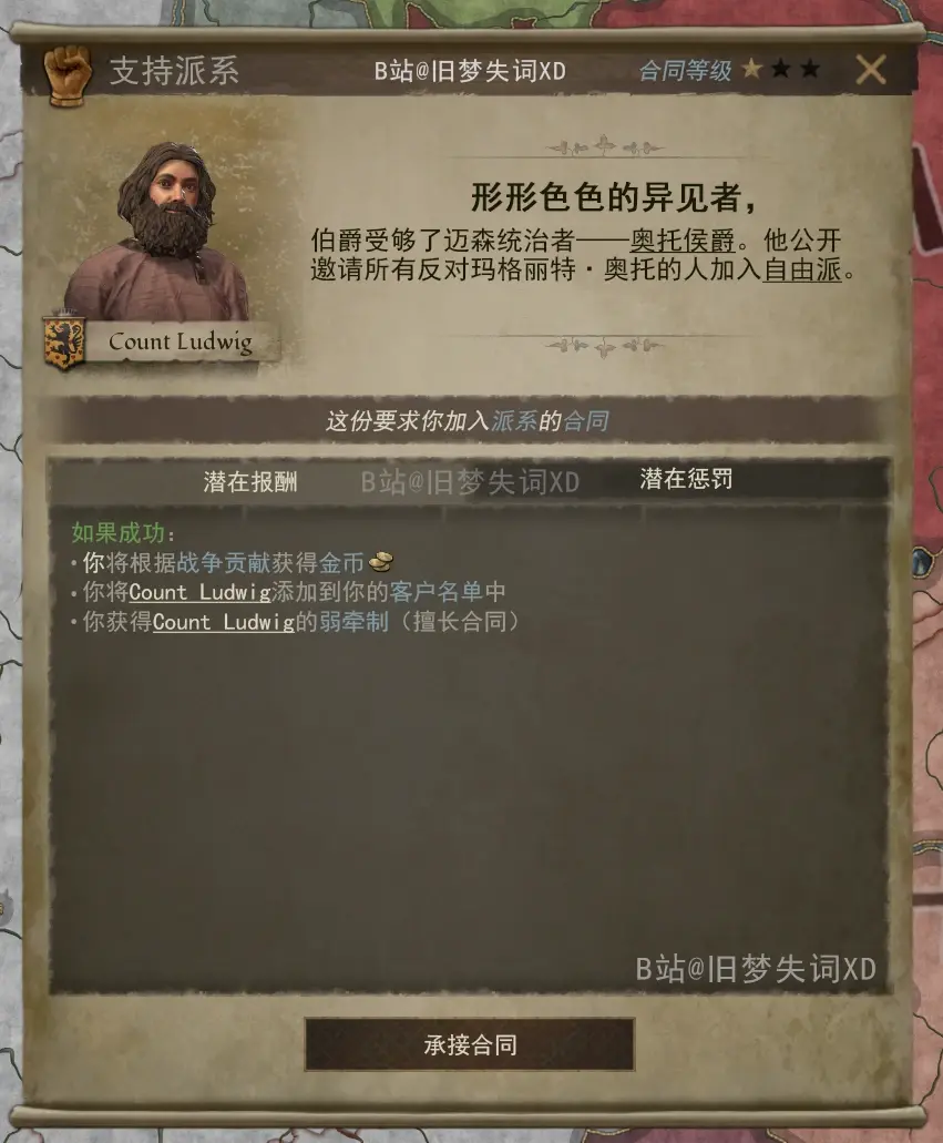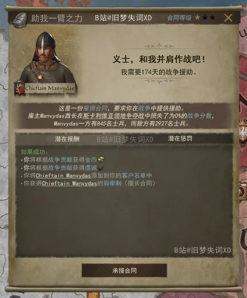 该目的的冒险者不会收到其他类型的合同,而是一类独特合同——他们将会支付金币,以寻求其他领主的支持。支持包括提供金币或军队,不过成功以后,雇主还是希望能吃点回扣。