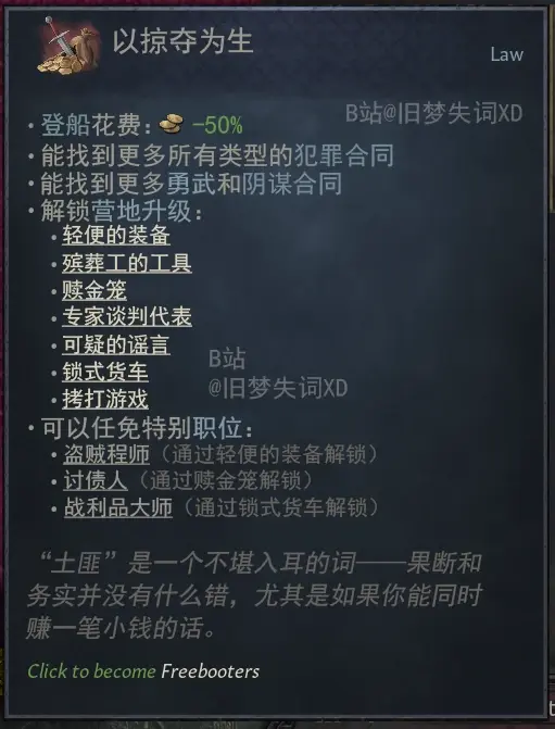以掠夺为生的冒险者专注于勇武,阴谋与犯罪合同。他们的升级通常会为计划提供加成,解锁特别擅长犯罪活动的,为阴谋提供巨额加成,并可以帮助你降低升级江湖恶名的成本。