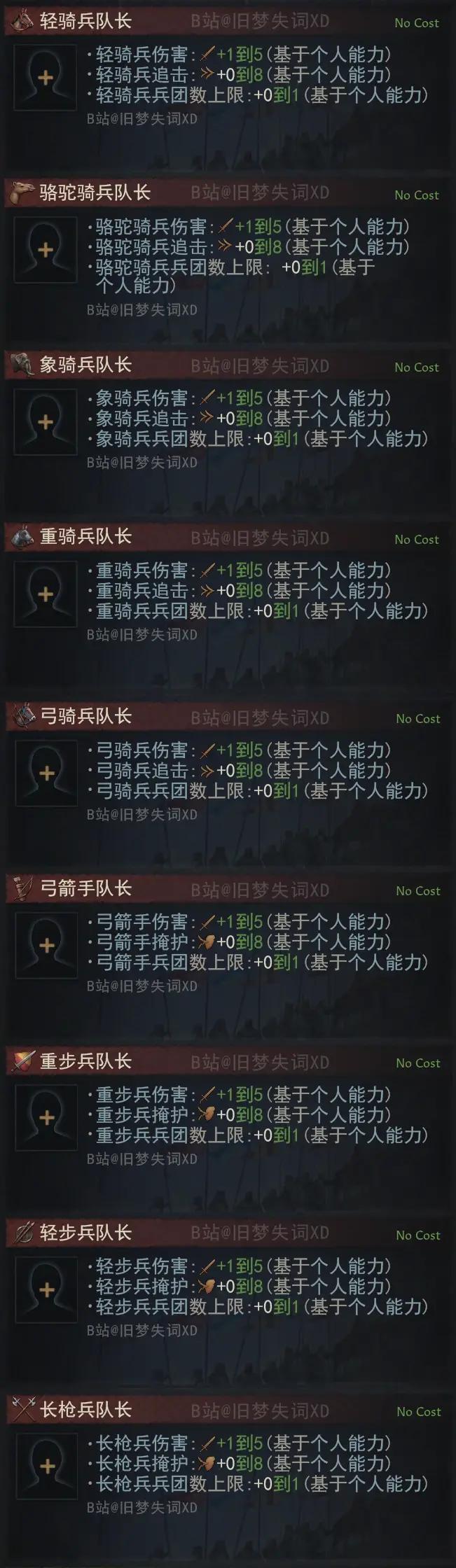 除了以上教义,以下文化传统也会触发该机制,分别是雇佣兵、马上领主、侠义结社、沿海战士、家族私兵。