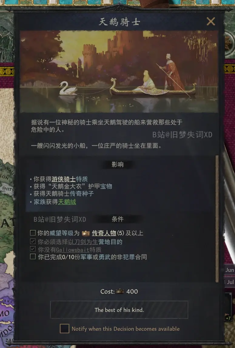 成为天鹅或当地文化动物的骑士需要大量威望,该决议可以获得专属特质、家族buff、宝物以及传说种子。
