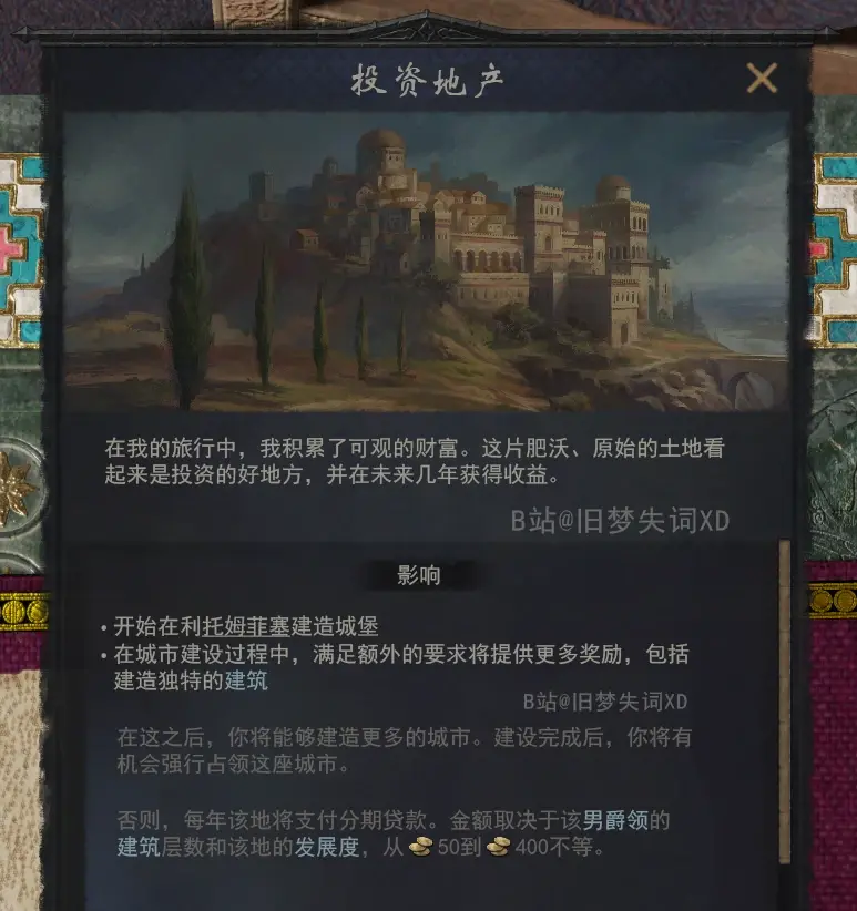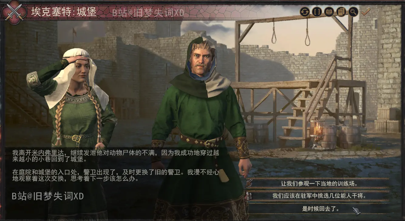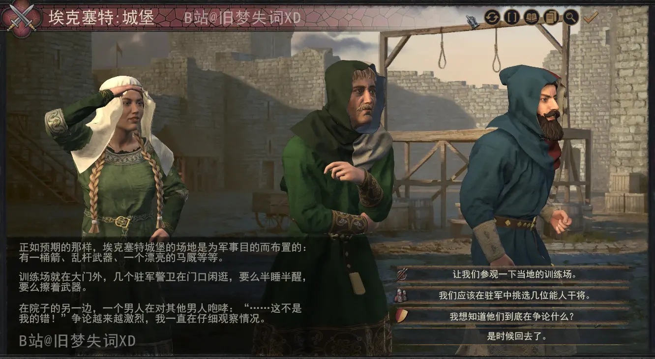 不同类型的地产有着不同类型的事件,城堡专注于无地冒险者的军事抉择,提高勇武、加强兵团、招募骑士等等...