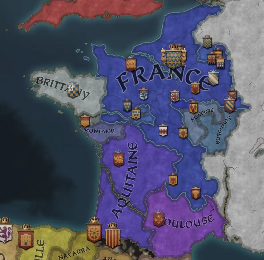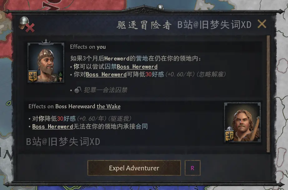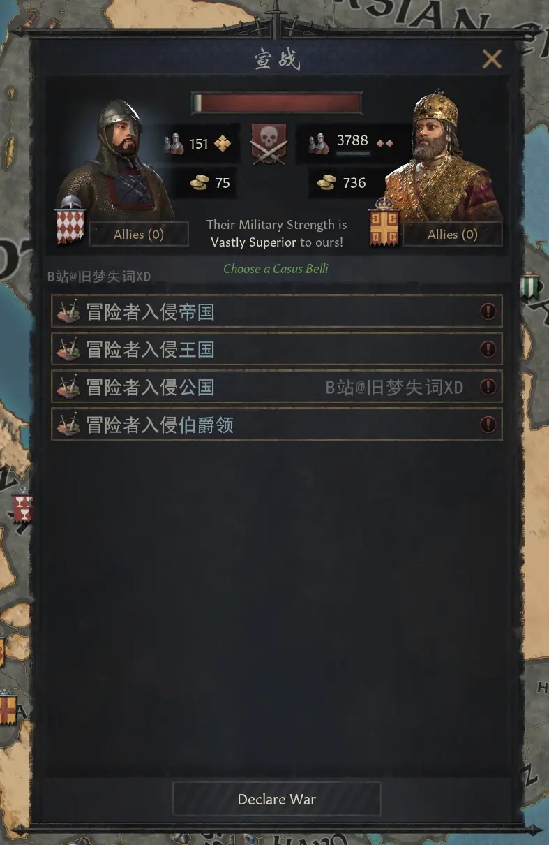 相对的,我们为冒险者提供了一个冒险者入侵借口,并且与其他入侵借口大差不差。选择一位领主,通过入侵来篡夺目标头衔下的所有领地。如果这是目标的唯一王国头衔,那么就会征服整个王国。