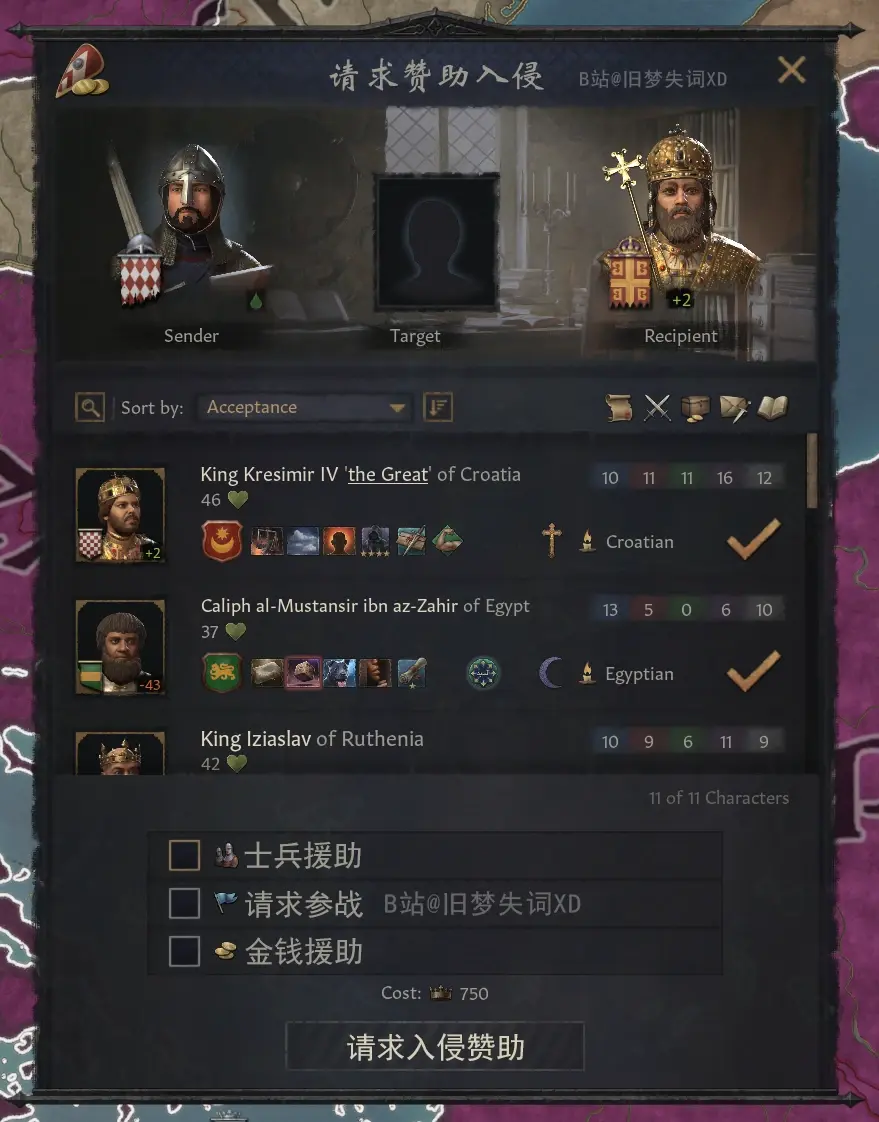 赞助人为国王或皇帝,他们通常会借给你士兵,如果他们打心底里喜欢你的话,甚至还会亲自下场与你并肩作战。同时,该方法打下后合法性也不会太糟糕。