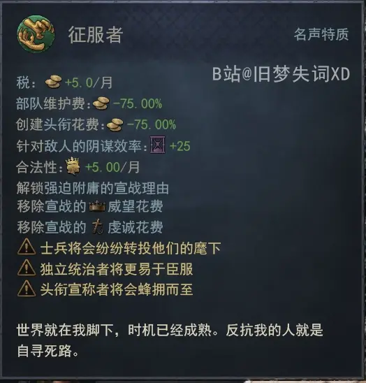 由于冒险者能花费威望的地方很少,所以宣战借口所需的威望会非常高。不过玩家可以通过生活方式、文化传统等方式来减少宣战成本。