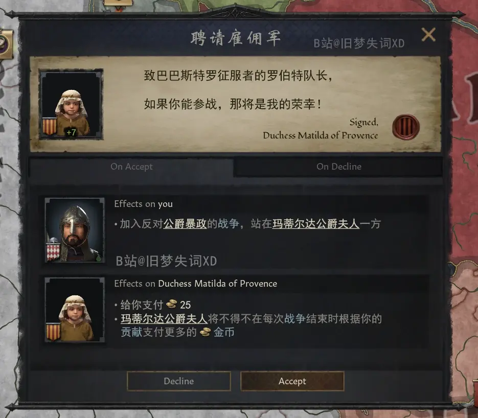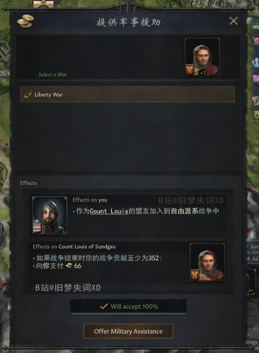 另一种参战方式是伊比利亚的命运dlc中的军事援助选项,即可绕过合同加入战争。不过该方法可获得的报酬要少得多,不过玩家可以借此机制来报复前雇主或者平衡某一地区的势力。