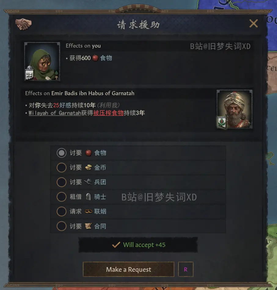 除了食物、金币、兵团、借用几个月的将领等援助,请求联姻选项是冒险者唯一一个可以与领主请求联姻的机制。