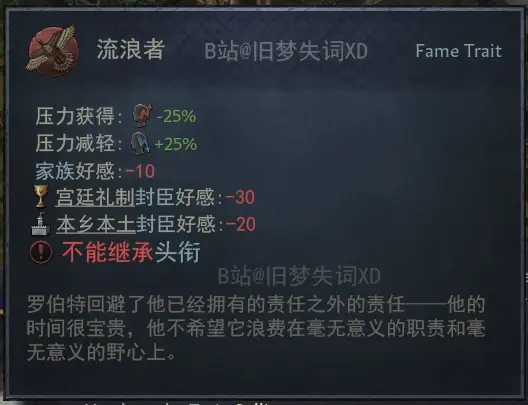 流浪者特质就是自愿被剥夺继承权,这将允许冒险者继续冒险,直到想到成为领主。但是这么做会惹恼你的家人,不过与自由相比,这也算不上什么。