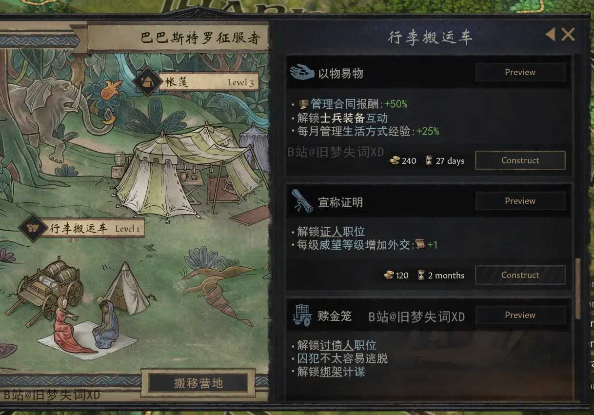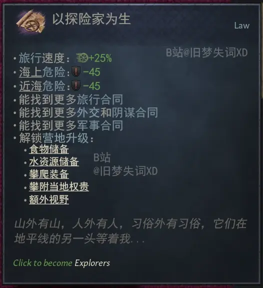 当玩家失去最后一块领地,并且非行政制家族,你就可以选择成为冒险者,以组建一个营地的方式来继续游玩这个角色。而电脑AI则需要考虑性格是否适合当冒险者。