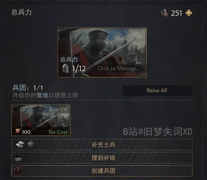 与赚钱的方式一样,我们尝试将冒险者军队与领主军队做出差异化——冒险者的部队更有可能是半持续作战的退伍军人和土匪(所以他们更强调武装人员),他们无论走到哪里都能招到战士(所以他们有许多不同团类型的拼凑混编部队),他们没有机会获得征税或低级别的封臣提供部队(所以他们必须更积极地招募战士)。