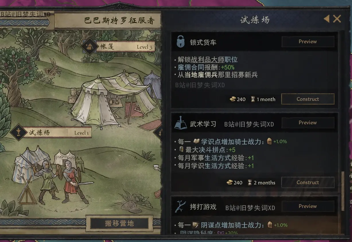 雇佣兵营地有两个强力建筑——试炼场和熊熊燃烧的篝火,也可以是行李搬运车或食堂。