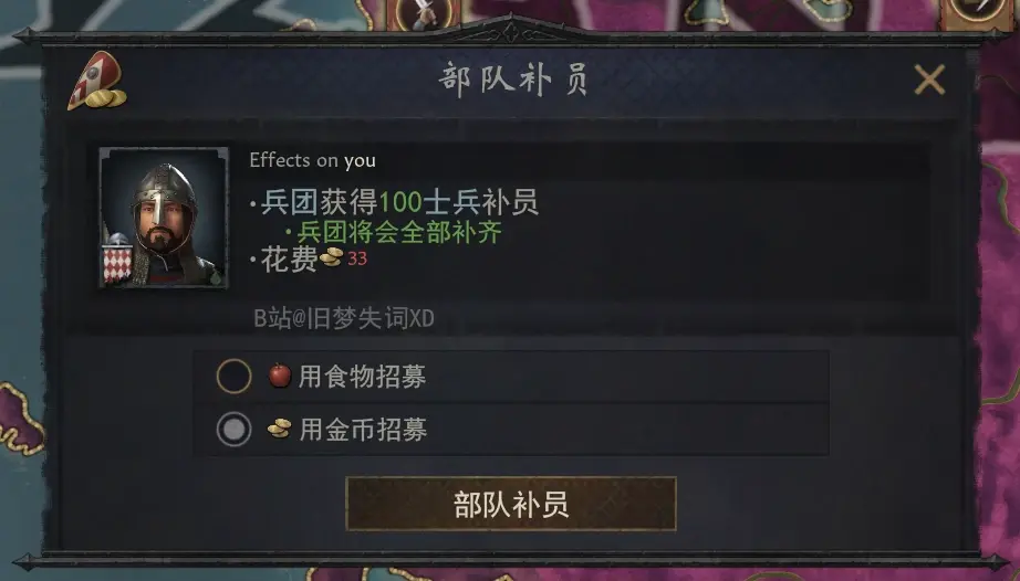 而补员人数与金币或食物成本成正比。如果你没有足够地资源来补员全部部队,你可以考虑用现有的部分资源进行部分补员。