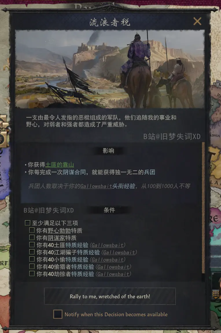 当有了足够的江湖恶名特质后,你可以点该决议,每次成功完成阴谋合同都将获得部分兵团,你的恶名越高,获得的兵团人数越多。