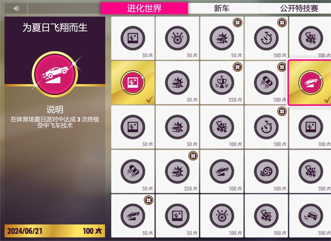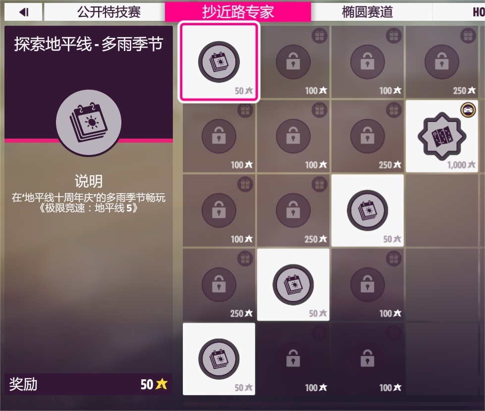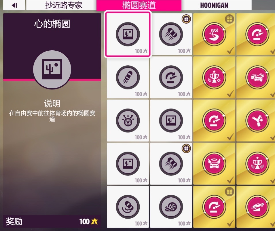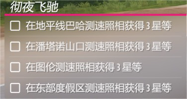 左邊10個爲限時完成,目前無法完成(其中自由賽是翻譯的問題,就是漫遊模式);右邊10個可以達成(大多較爲簡單,這裏不再贅述,特別提醒一下,要在橢圓環道中達成三次驚人極速,需要加速快、操控好的車輛,我用的是梅奔AMG ONE)