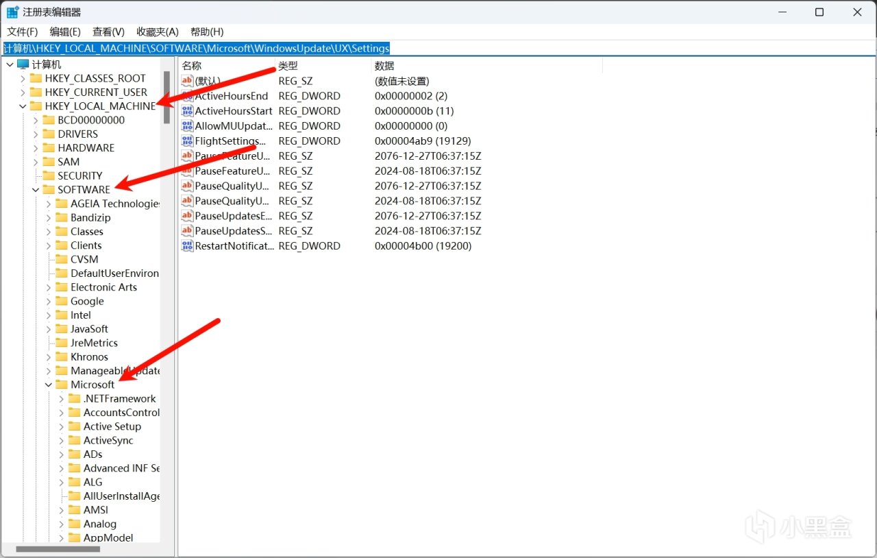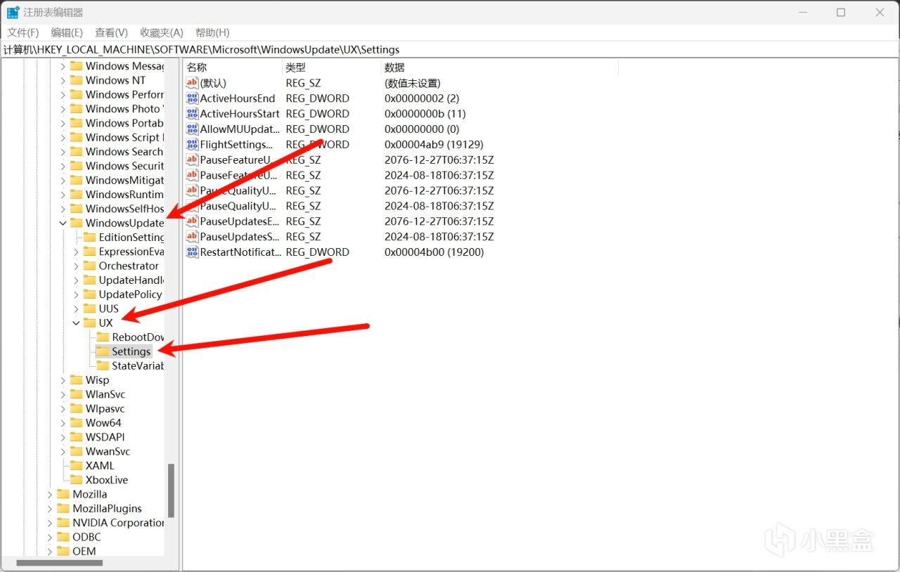 计算机\HKEY_LOCAL_MACHINE\SOFTWARE\Microsoft\WindowsUpdate\UX\Settings
