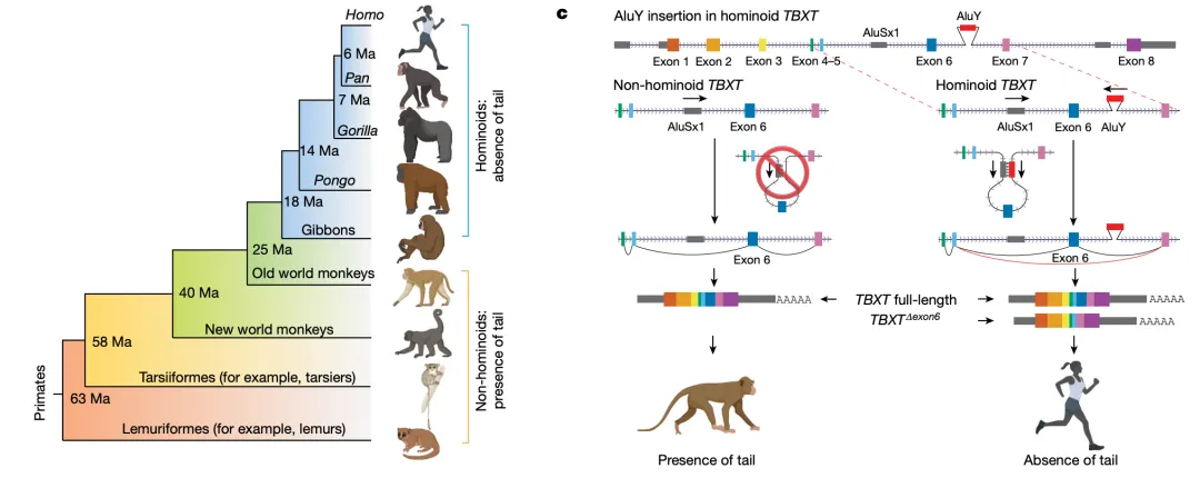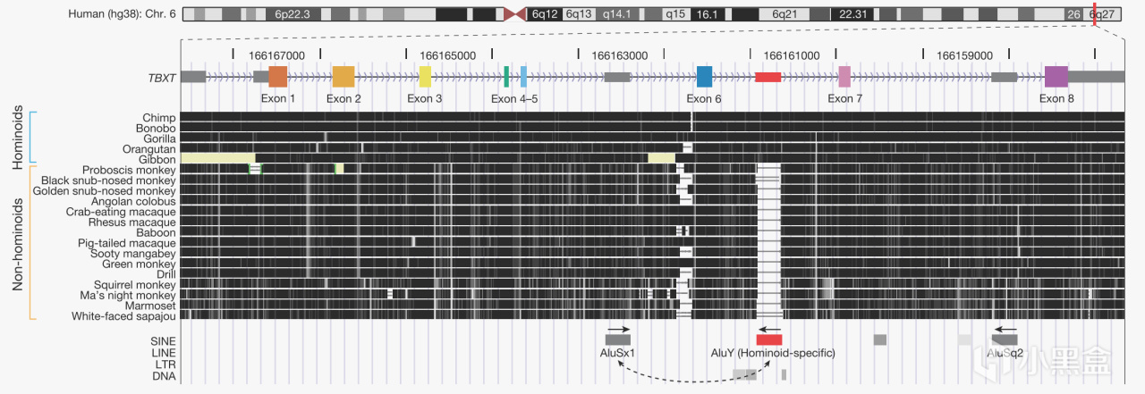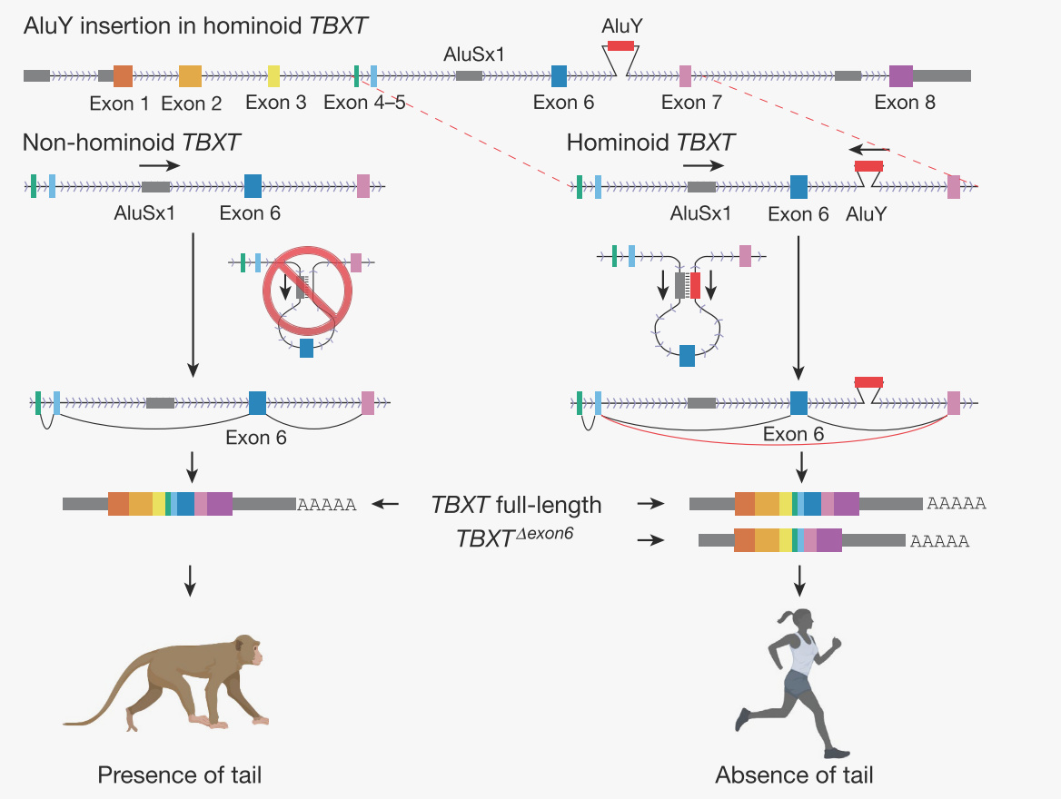 首先,研究人员在TBXT基因(位于6号染色体的长臂)的内含子中发现了一个类人猿特有的“AluY元素”的插入的基因序列,这个基因序列与另一个所有灵长类所共有的“AluSx1元素”形成了一个特殊的茎环结构,称为:TBXTΔexon6