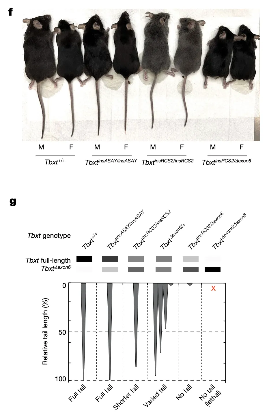前文说到,小鼠的TBXT基因是没有变异的,因此它们也有完整且正常的尾巴。因此,实验人员在小鼠中进行了相关基因的敲除。