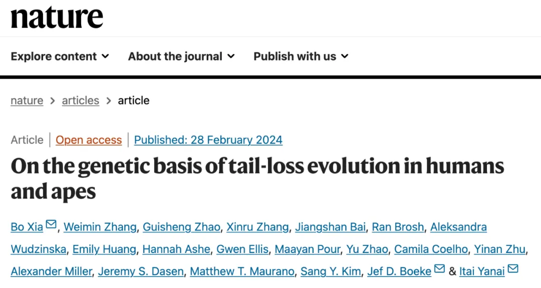 3、Xia B, Zhang W, Zhao G, Zhang X, Bai J, Brosh R, Wudzinska A, Huang E, Ashe H, Ellis G, Pour M, Zhao Y, Coelho C, Zhu Y, Miller A, Dasen JS, Maurano MT, Kim SY, Boeke JD, Yanai I. On the genetic basis of tail-loss evolution in humans and apes. Nature. 2024 Feb;626(8001):1042-1048. doi: 10.1038/s41586-024-07095-8 . Epub 2024 Feb 28. PMID: 38418917; PMCID: PMC10901737.