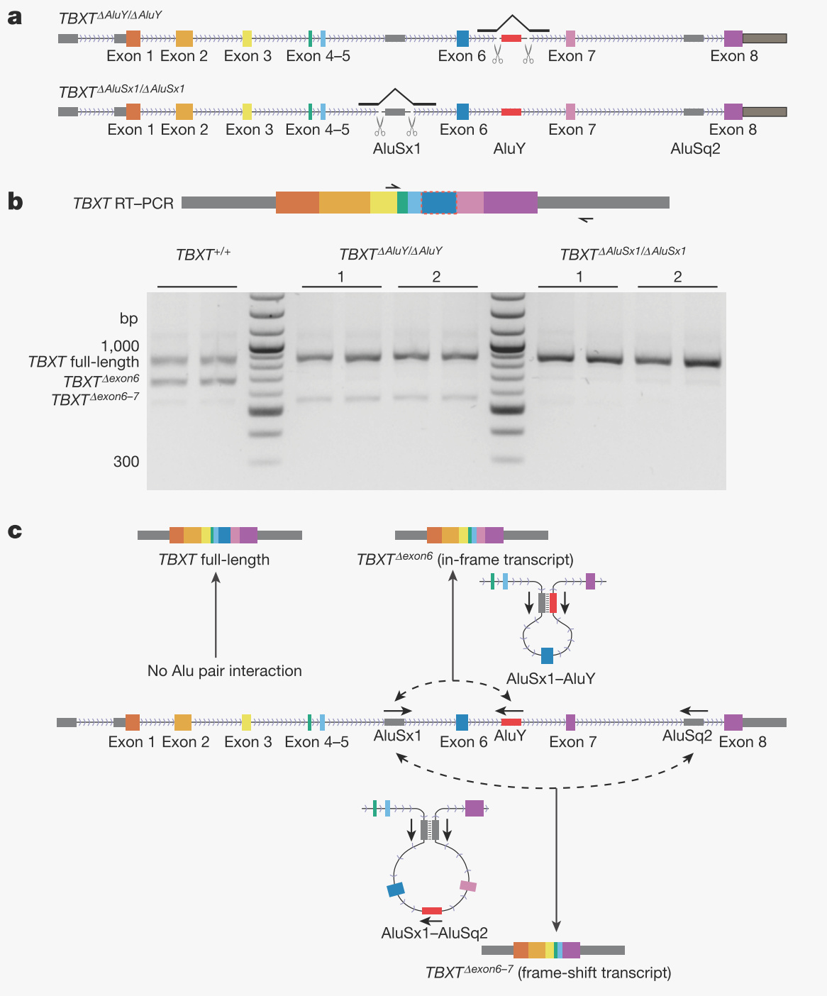 AluY存在于TBXT第6个外显子的下游,在其上游还有另一个古老的Alu元件——AluSx1,两者通过反向互补形成茎环结构,促进第6外显子的跳跃缺失,从而生成一个短的TBXT转录本——TBXTΔexon6。