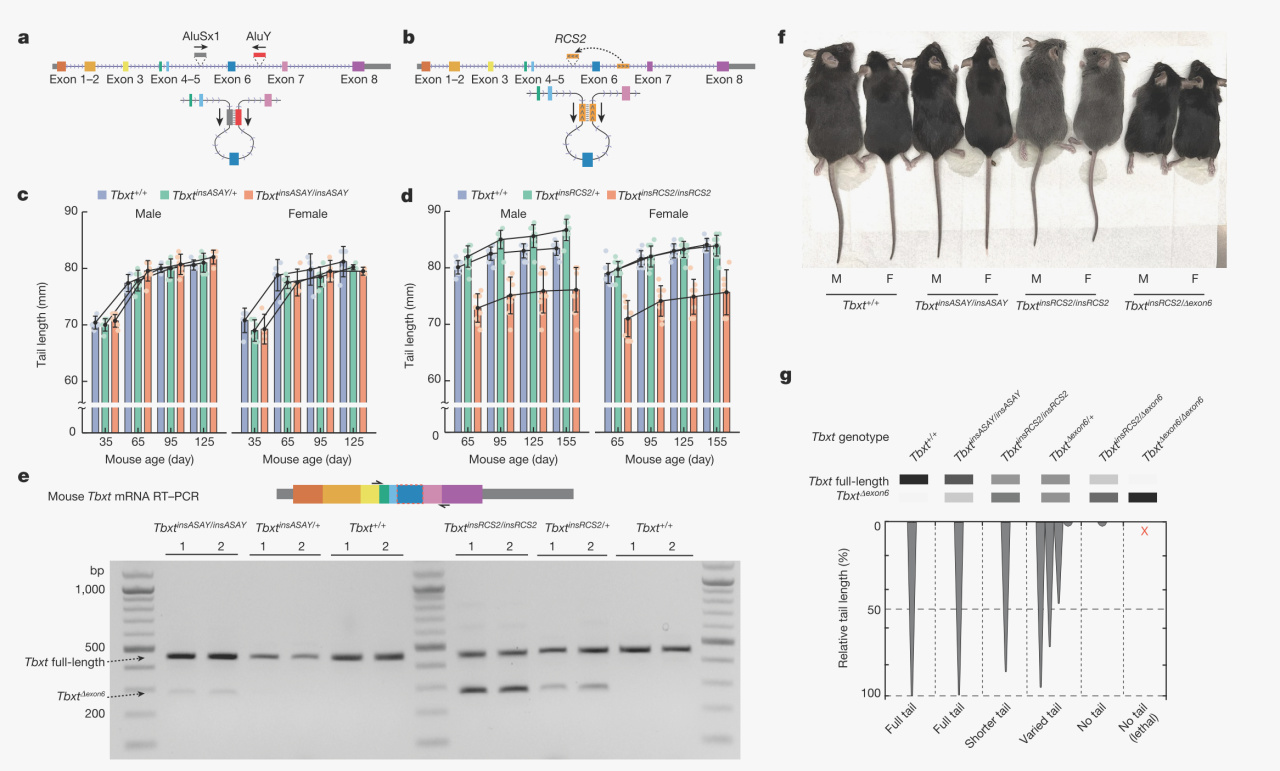 另外,研究人员还验证了这种特殊的转录本——TBXTΔexon6——仅在人类体内存在,而小鼠中不存在。并且在小鼠基因组中并未发现上述两种Alu元素。