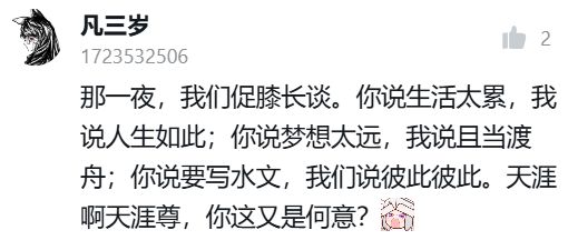 我很喜歡天涯老師在文末與其他老師文章聯動的那段。我從他的文段裏讀出了深度的思考,以及看到優秀作品時心靈深處無處安放、激盪的創作欲。我覺得這是對每一個作者來說都非常珍貴的狀態。