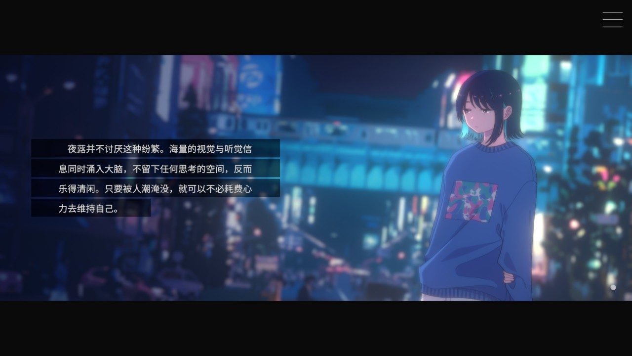 儘管劇情稍顯晦澀,可能需要對下電波,但瀰漫在整部作品裏面的整體氛圍感,特別是夜晚那種孤寂清冷的感覺,讓人有些過癮。遊戲玩法上仍然是傳統的視覺小說爲主,夾雜了一些選詞填空式的玩法,說不上無聊,但也確實僅僅是添頭。而缺少配音也讓遊戲在一定程度上少了幾分情感的宣泄力度,但暗沉的氛圍和還算不錯的立繪及背景則彌補了這點。