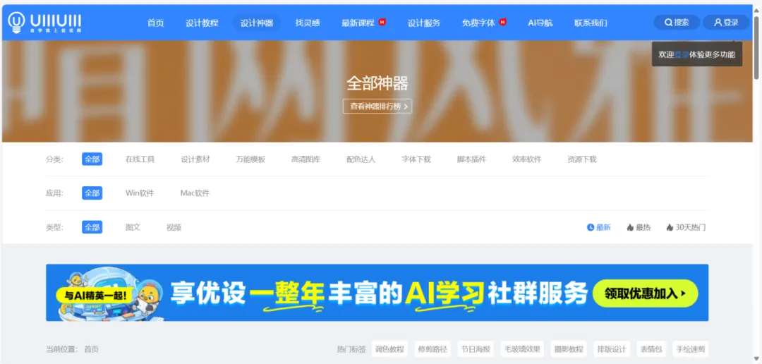 热门标签分类:网站通过热门标签对工具进行分类,如C4D动画、拟物、写实、字体效果、动态版式、调色教程、图形设计等,方便用户快速找到所需的设计工具或教程。