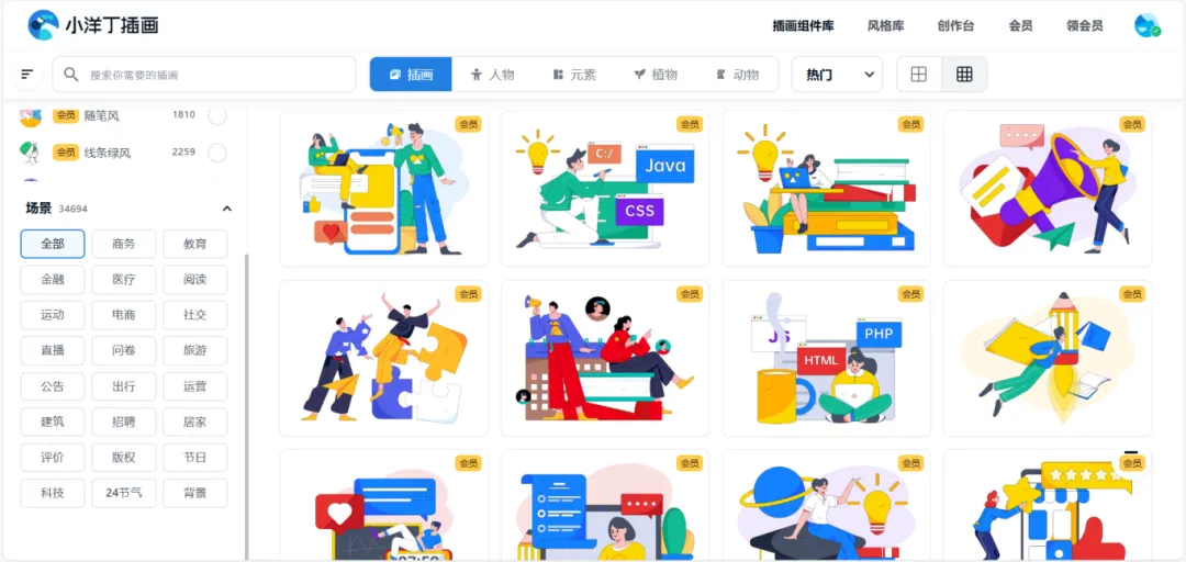 插画组件库丰富:提供了与近百位插画师共创的多套精美插画组件库,这些组件库风格多样,能够满足不同设计需求。