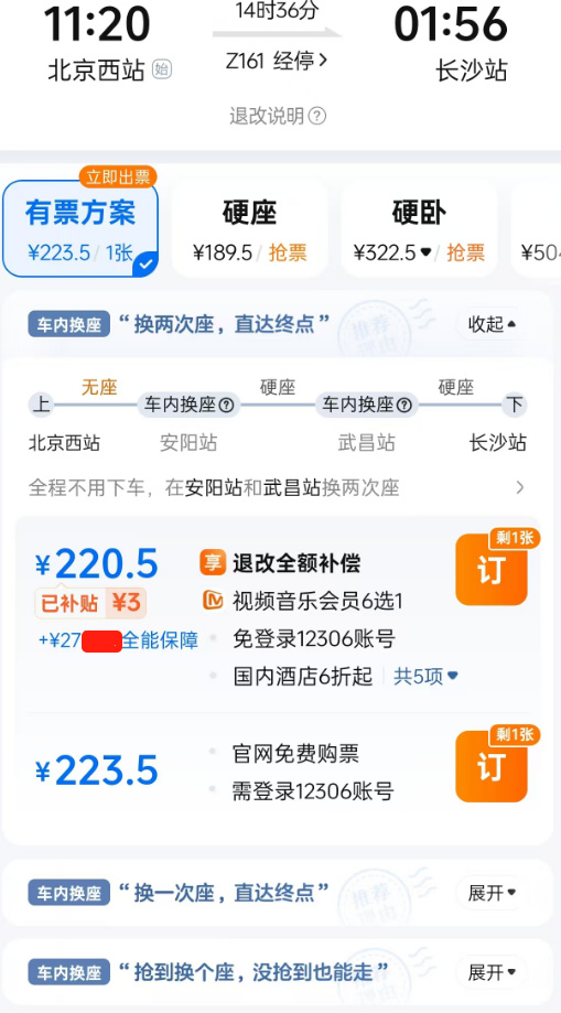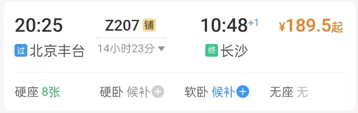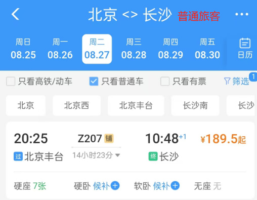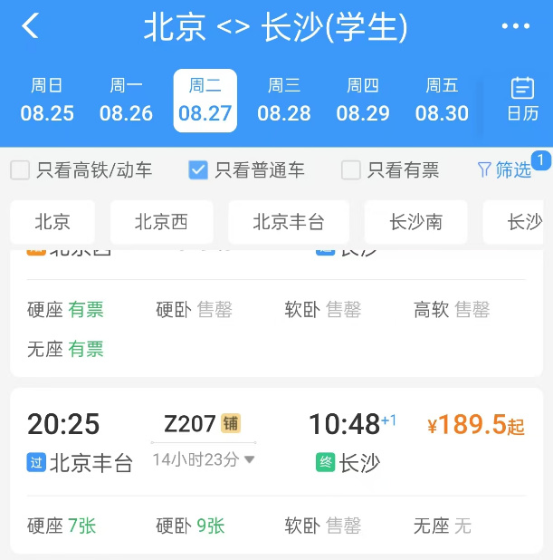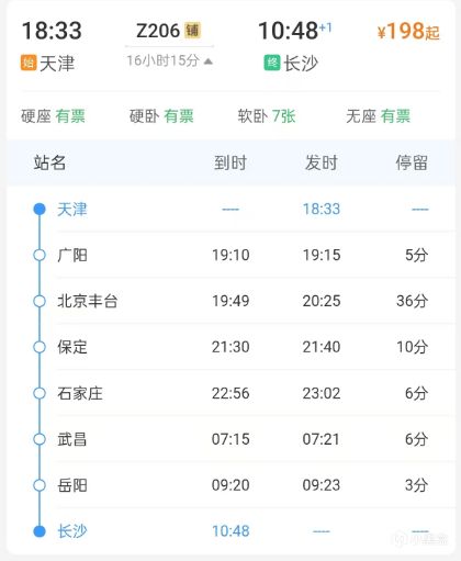 许多盒友会很疑惑,明明天津-长沙余票充足,那么北京丰台的余票也应充足才对。就在盒友疑惑并刷新页面的时候