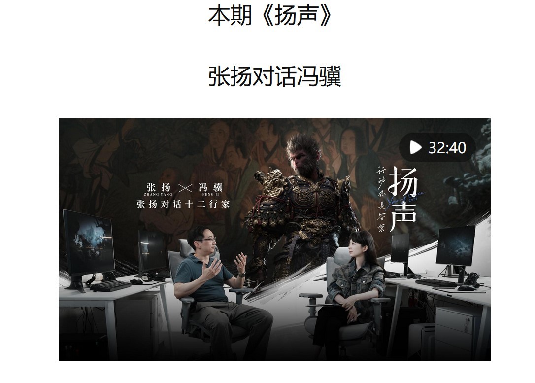 《黑神話:悟空》訪談片【揚聲】(時長32:40),《黑神話:悟空》製作人馮驥及主創團隊成員,接受了新華社記者張揚的獨家專訪。