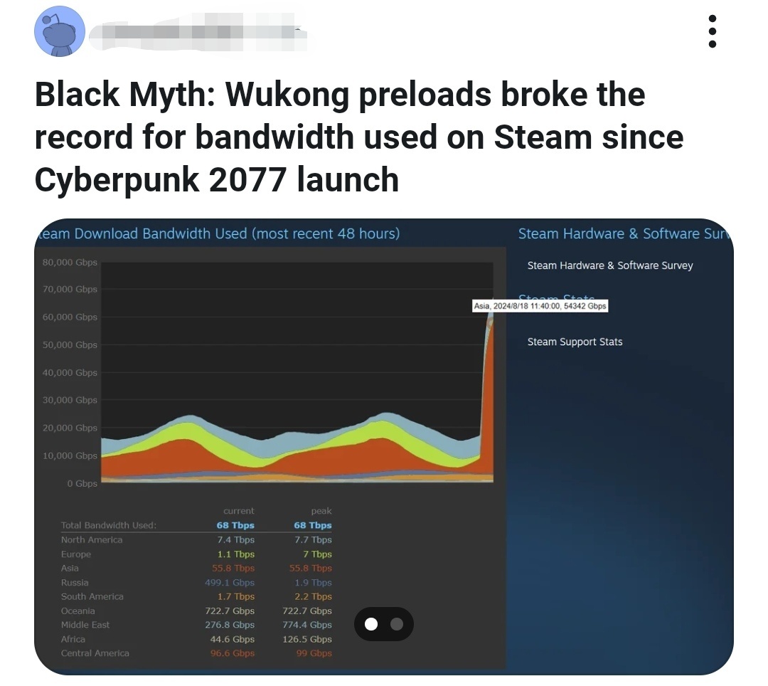 - 《黑神話:悟空》的預加載打破了自《賽博朋克2077》發佈以來Steam上使用的帶寬記錄