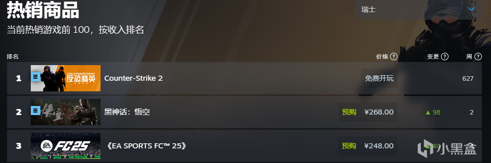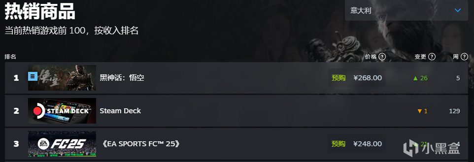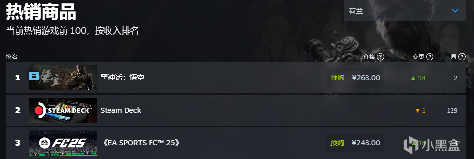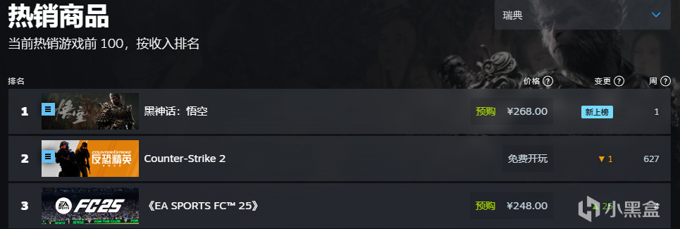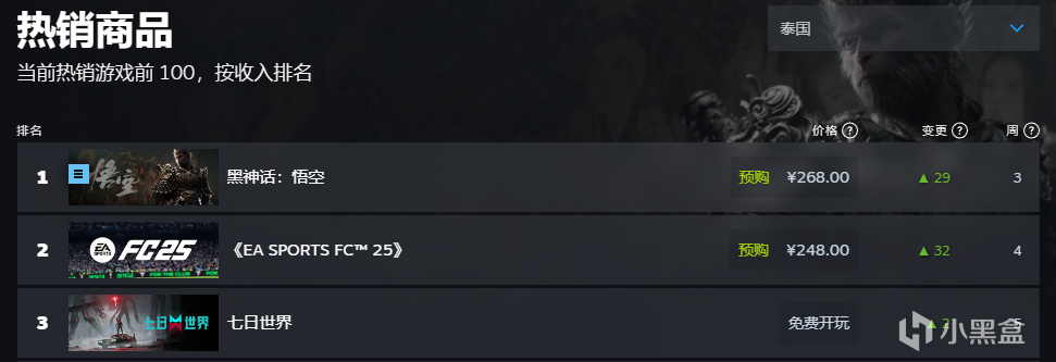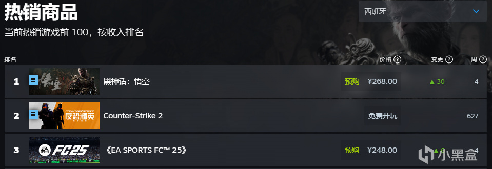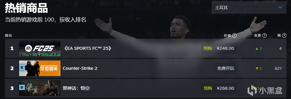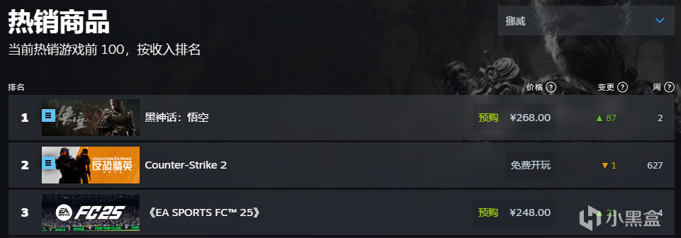 不過在土區《黑神話悟空》只排在了第二,輸給了EA的FC 25。