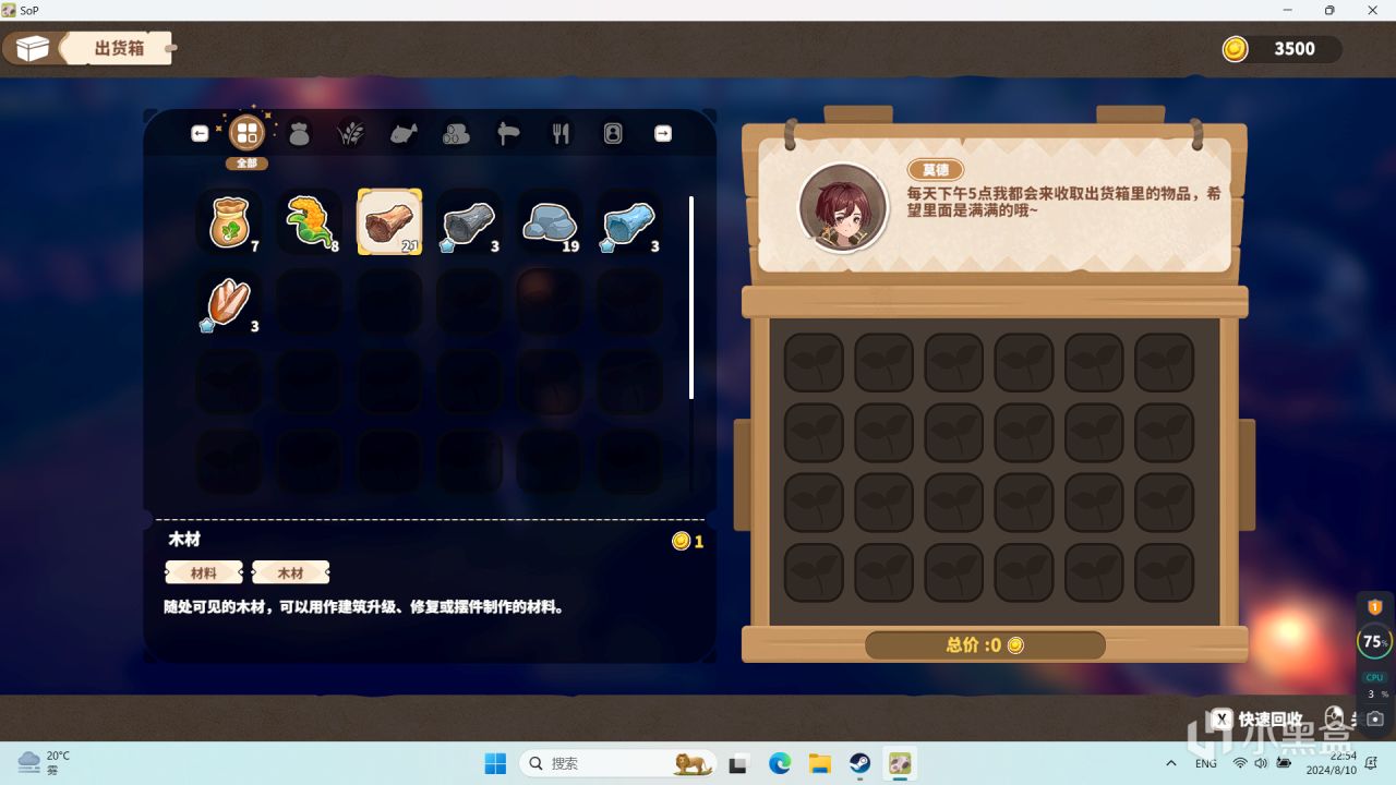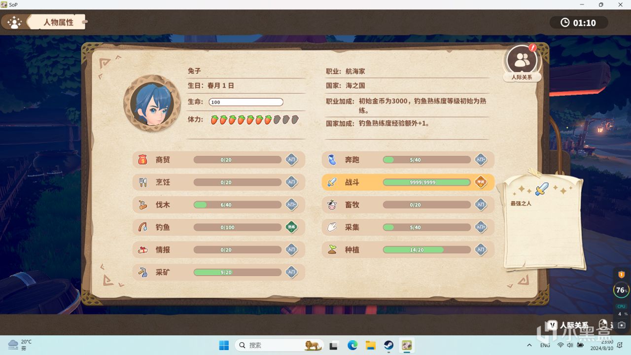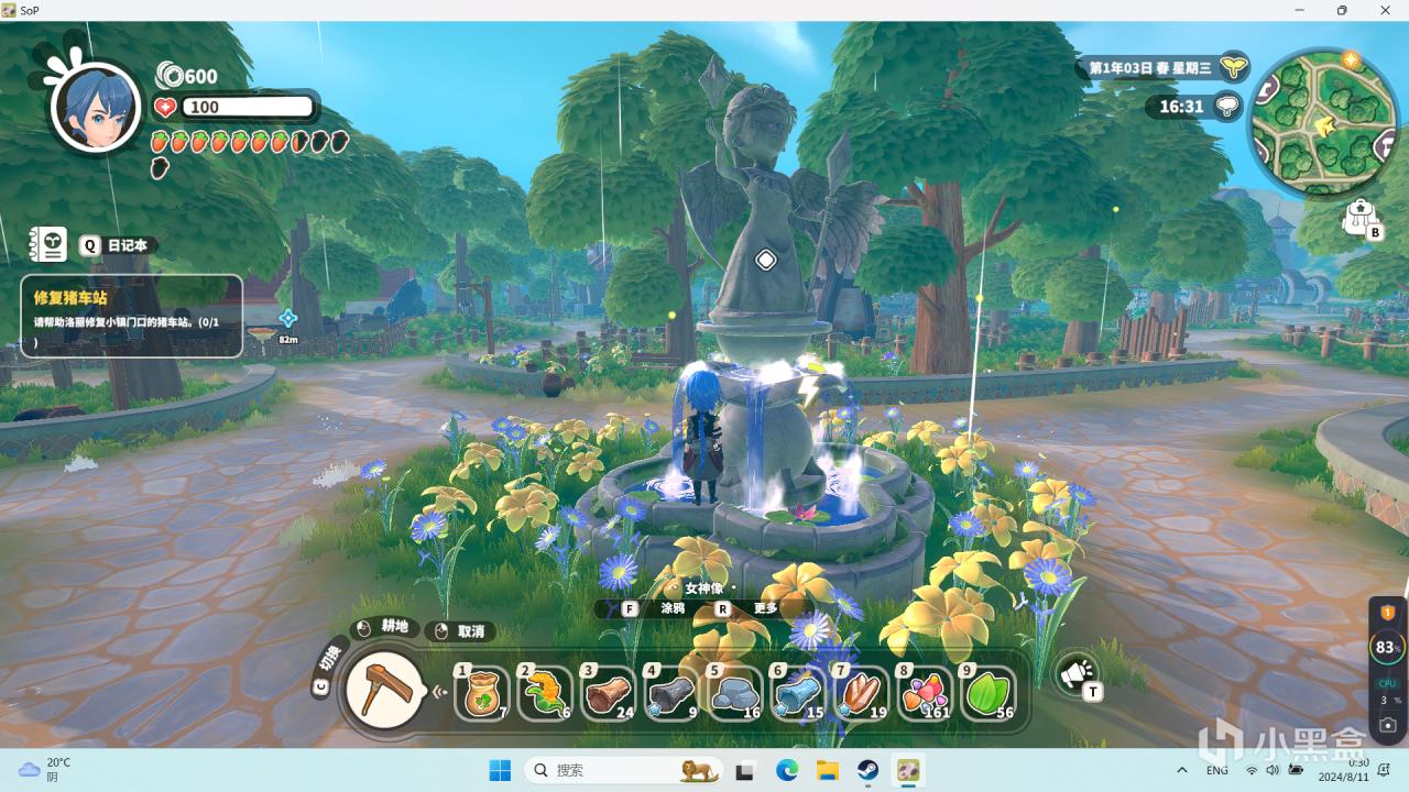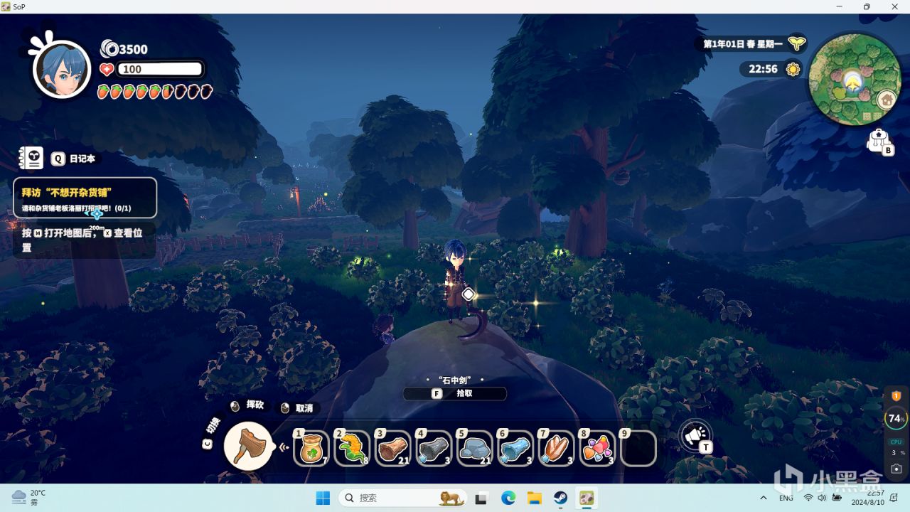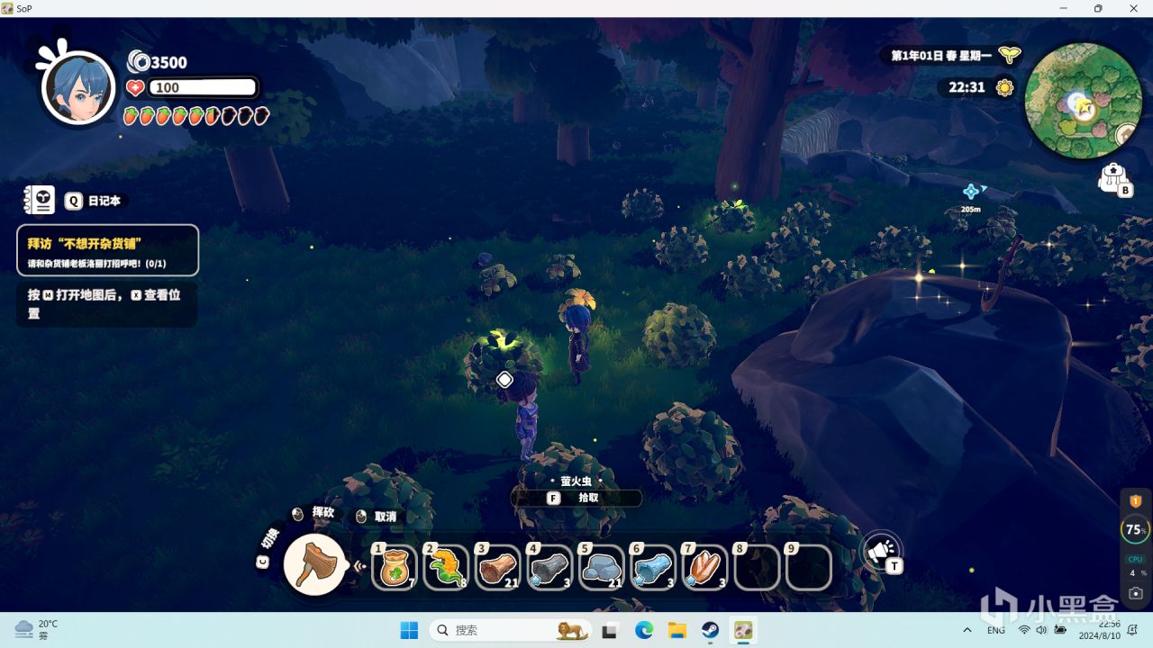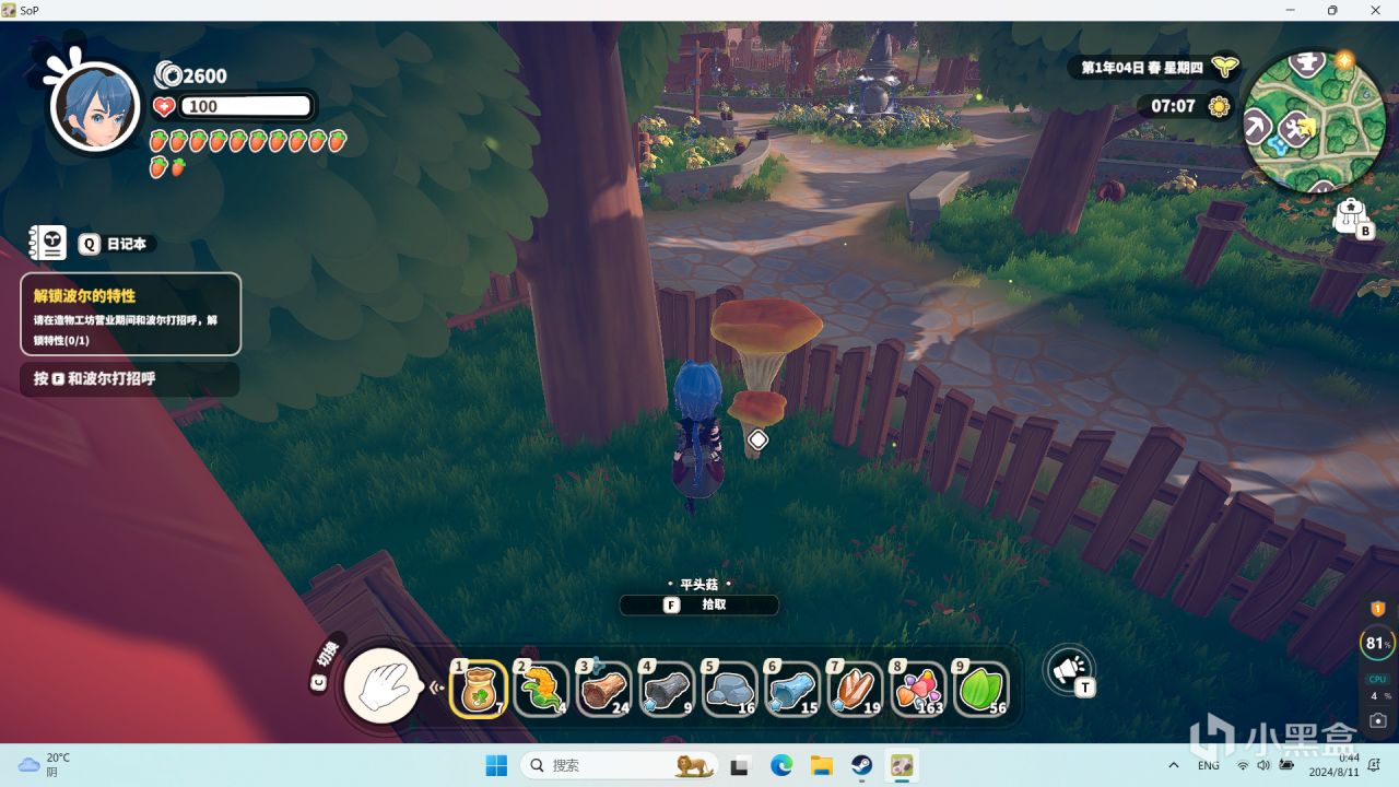 哦順帶提一下游戲是擁有天氣系統,時間系統的,有早晚,旁邊的蘿蔔是體力,體力用完後在野外就會睡覺了。