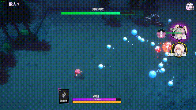 而“铃仙”自然也有自己的专属技能。通过攻击敌人积满大招条后,即可触发大招,射出一团团火焰来将敌人烧成灰。大招的CD间隔基本很短,积攒大招能量条的速度也很快,你只需不断对敌人输出,就能在5秒内迅速积满大招条,接着对敌人展开强力释放。