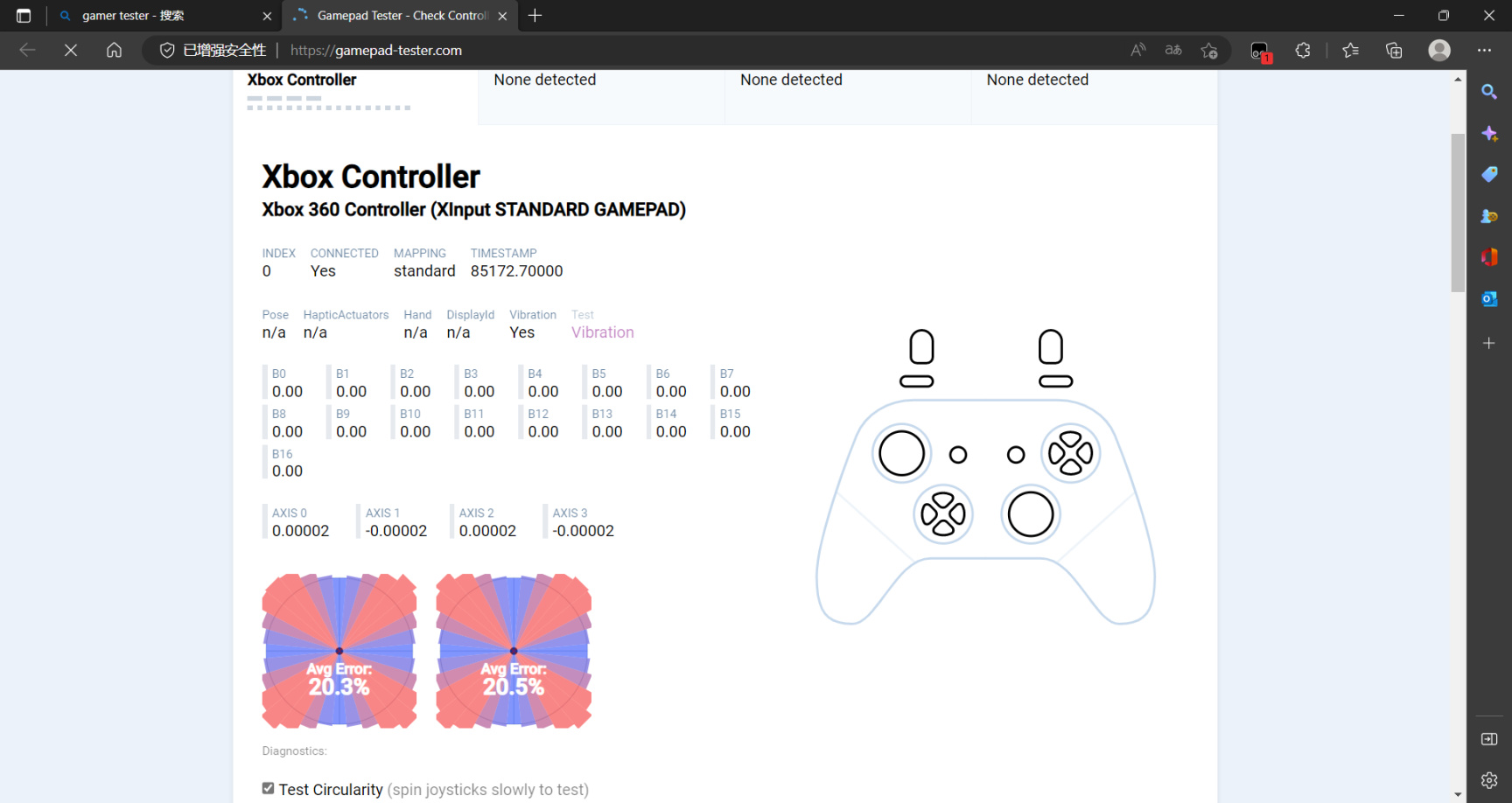 搖桿的調教是方形,在手柄背部有一個m鍵,可以開啓無死區模式,這個功能對於fps玩家來說還是很好用的。測試中無死區模式調教是圓形的,而有死區模式下是方形的。