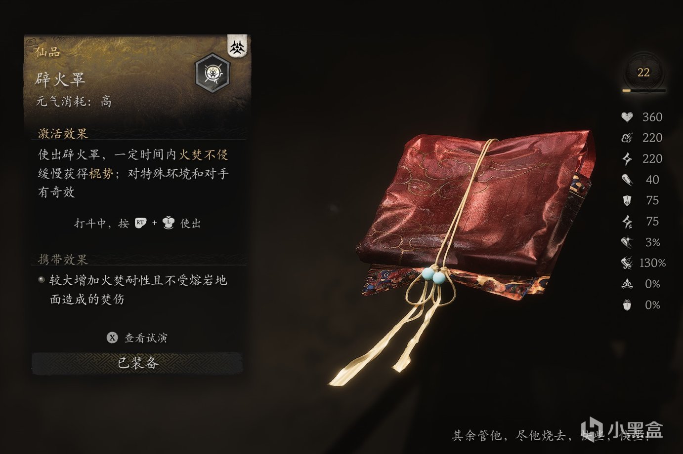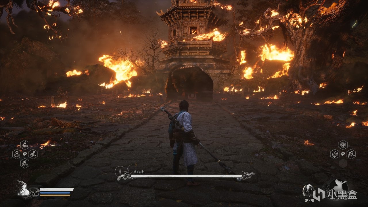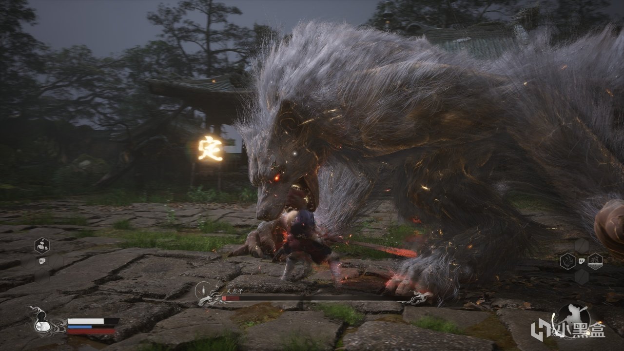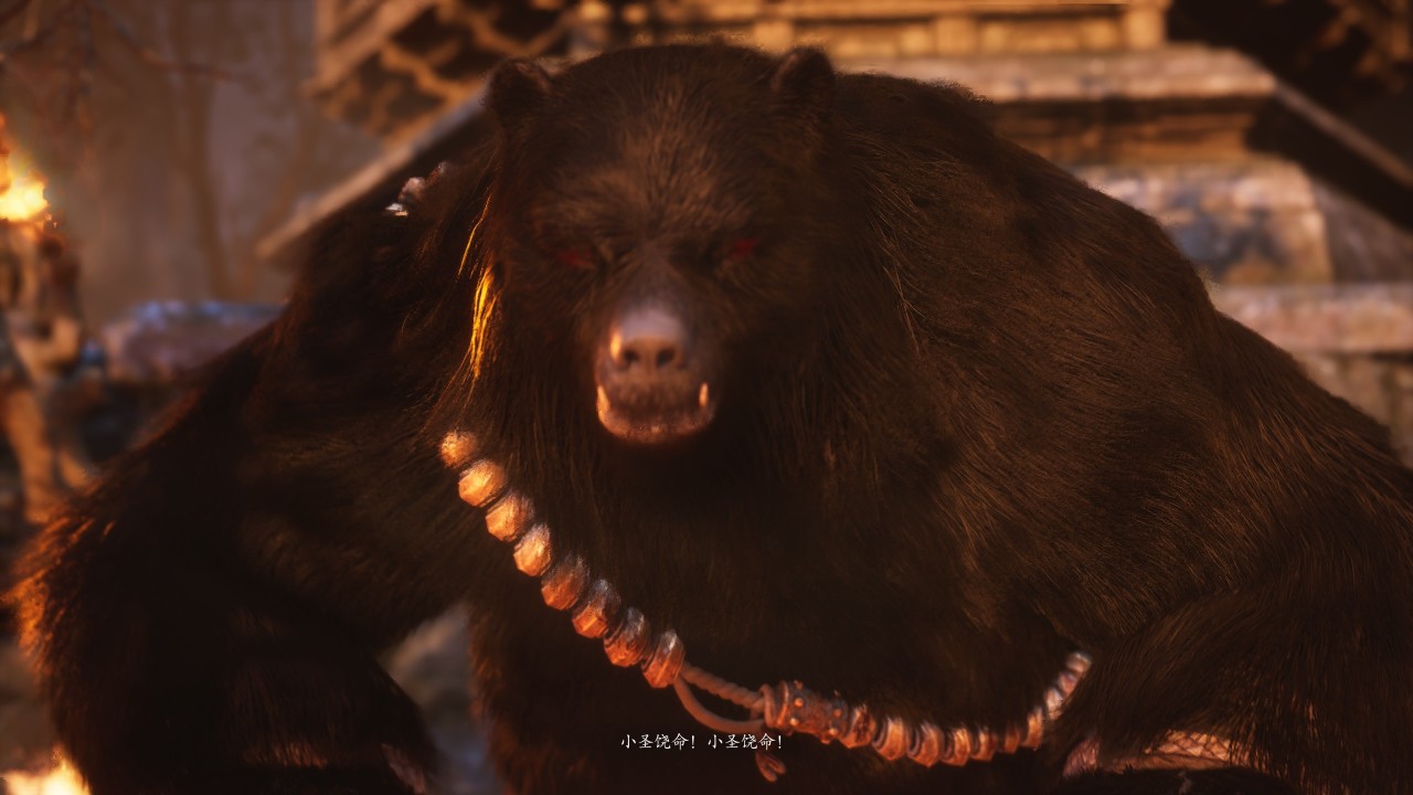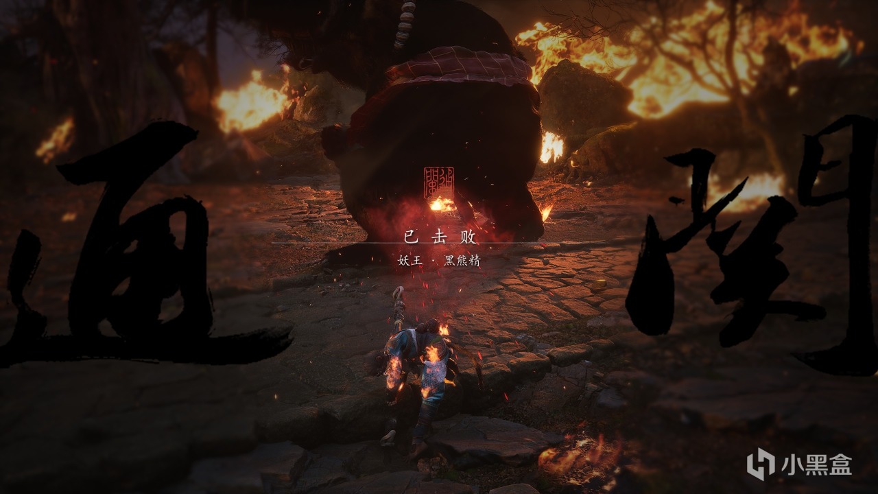 可能是黑猴第一個比較有挑戰性的BOSS,熊瞎子的難點是:場地大範圍的火帶來燃燒不利狀態、隱身後連續豬車,第一點就是隱藏法寶庇火罩的技能可以完破,第二點可以靠變身拖時長(開庇火罩也能大幅減傷)。