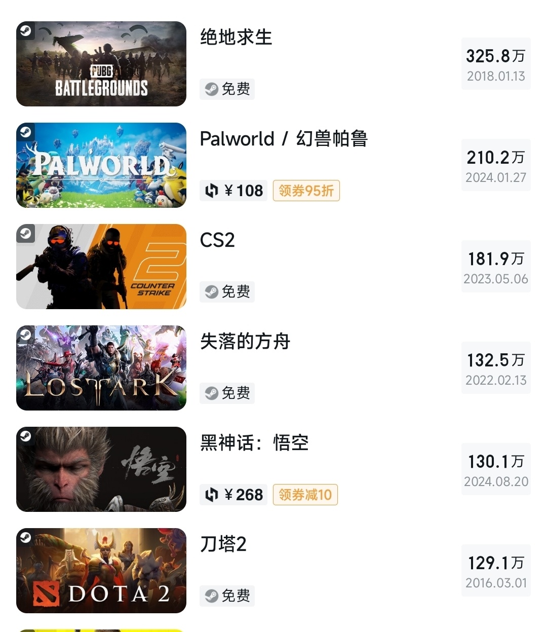截止發文時間12:20,《黑神話:悟空》steam實時在線人數排名第一,在線峯值破130萬,歷史在線峯值排名第五超越《dota2》。如果算上PS5/WEGAME/EPIC,《黑神話》同時在線玩家輕輕鬆鬆破200萬。