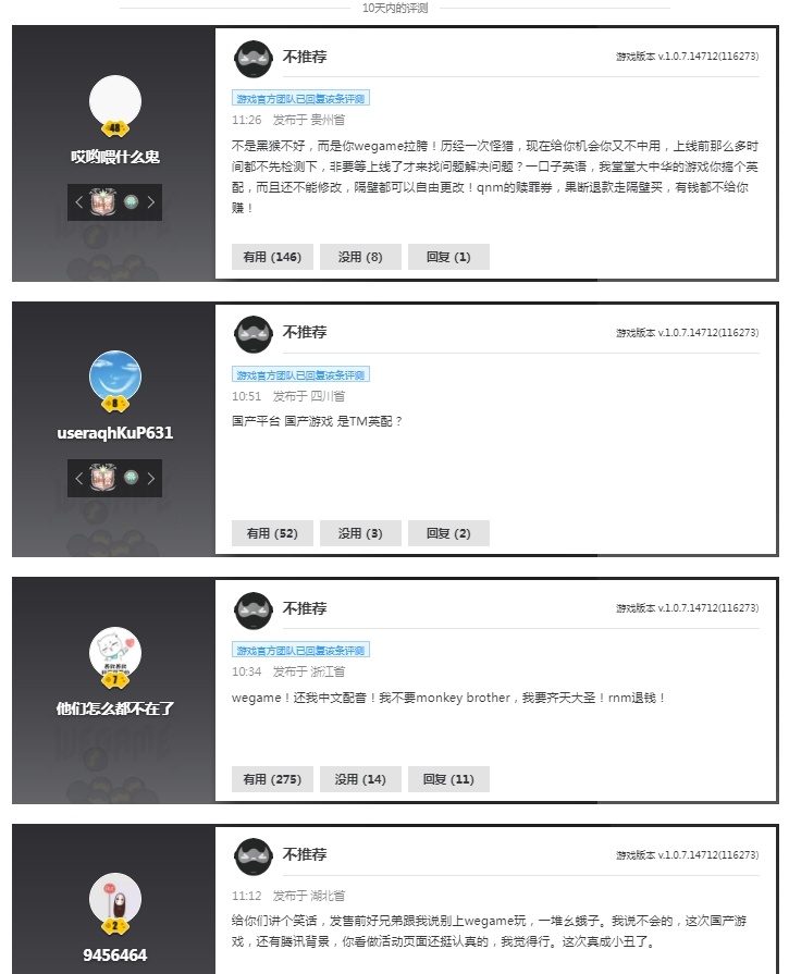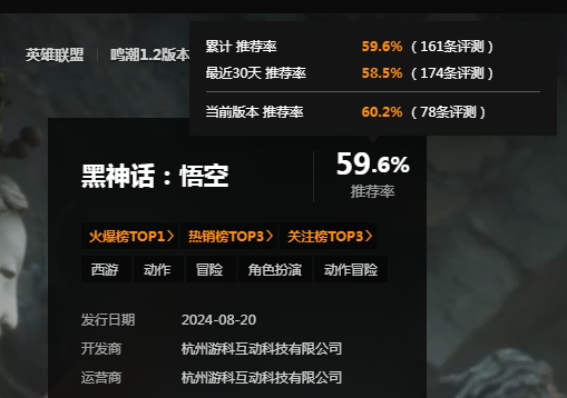 《黑神话:悟空》在腾讯WEGAME平台收到用户评测161条,累计 推荐率59.6%。差评玩家主要吐槽WEGAME平台问题,比如中文配音缺失,而非游戏本身质量。