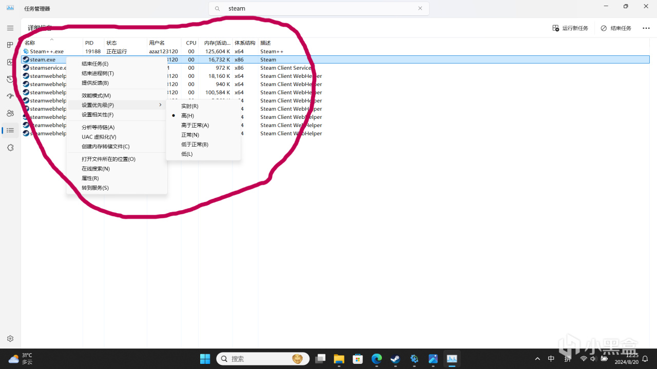 解決方案2:請打開任務管理器,清除後臺並且設置steam優先級最高