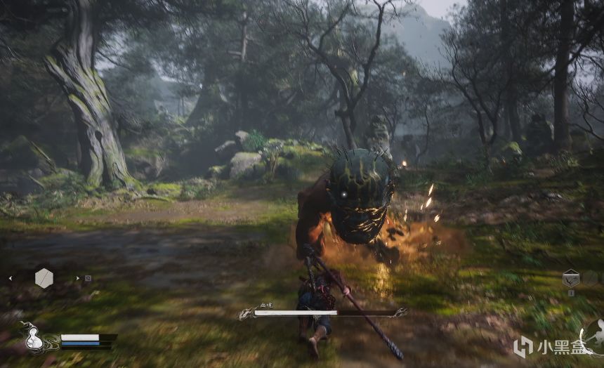 總的來說,在與其交戰時,可以上前用棍勢狂打一通,在對方即將起手攻擊時,用土地公傳授的定身法將其定住,繼續連擊,這兩套動作下來,基本都能打出一個強力跳劈,將大頭的防勢擊破,使其暫時倒地不起。