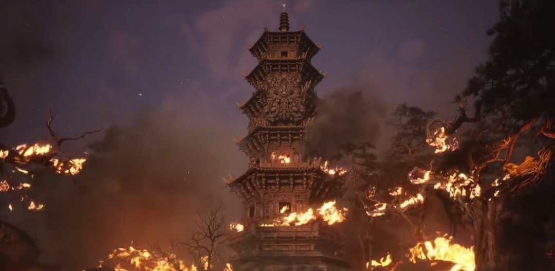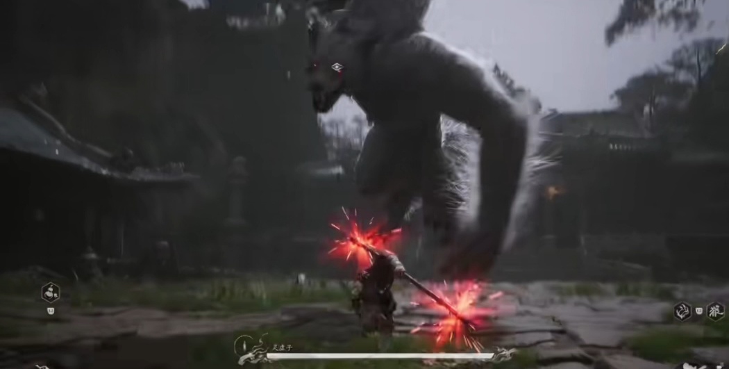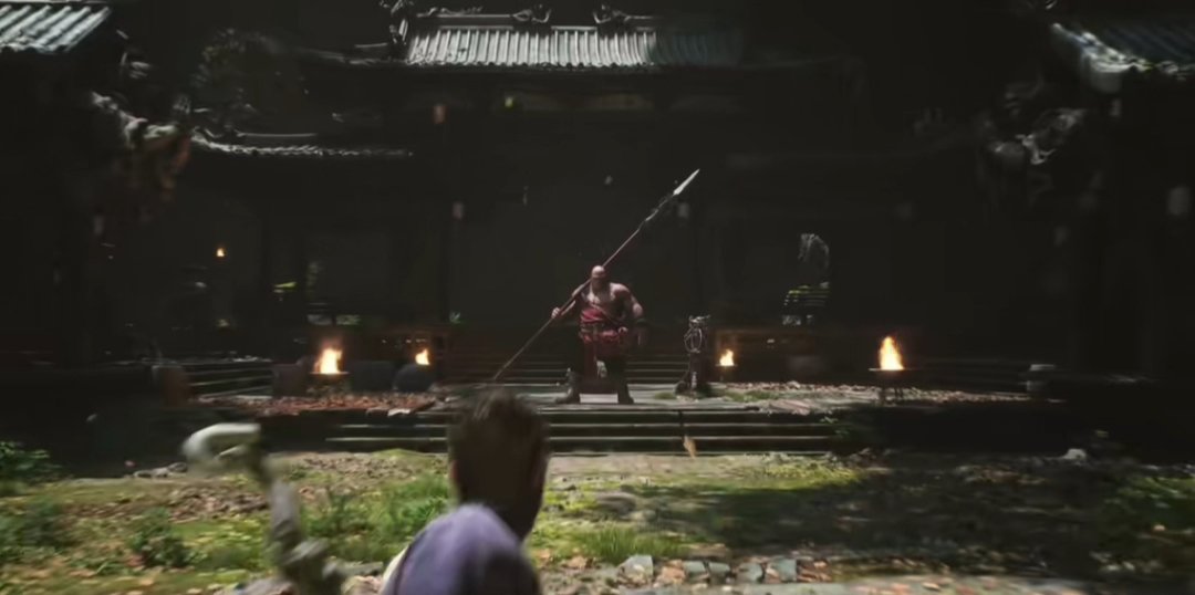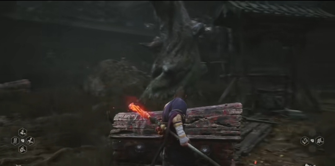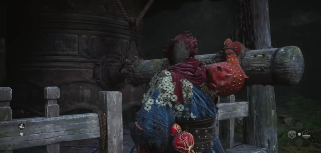 回到篝火处,我们从篝火一直往前出发,来到这个大门口,这里可以触发Boss战广智。击杀后可以获得变身术以及可以敲响第一口钟。第一章中共有三口钟,是隐藏关卡的钥匙。