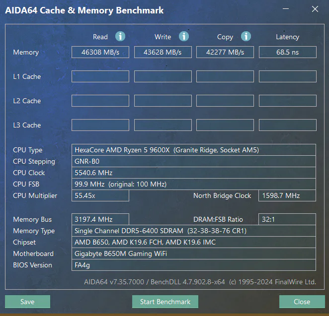 在BIOS裏面直接設置6400Mhz,其他參數不變,讀取來到4.6萬,寫入4.3萬,拷貝4.2萬,延遲68.5,從帶寬提升來看,總體提升接近6%左右。