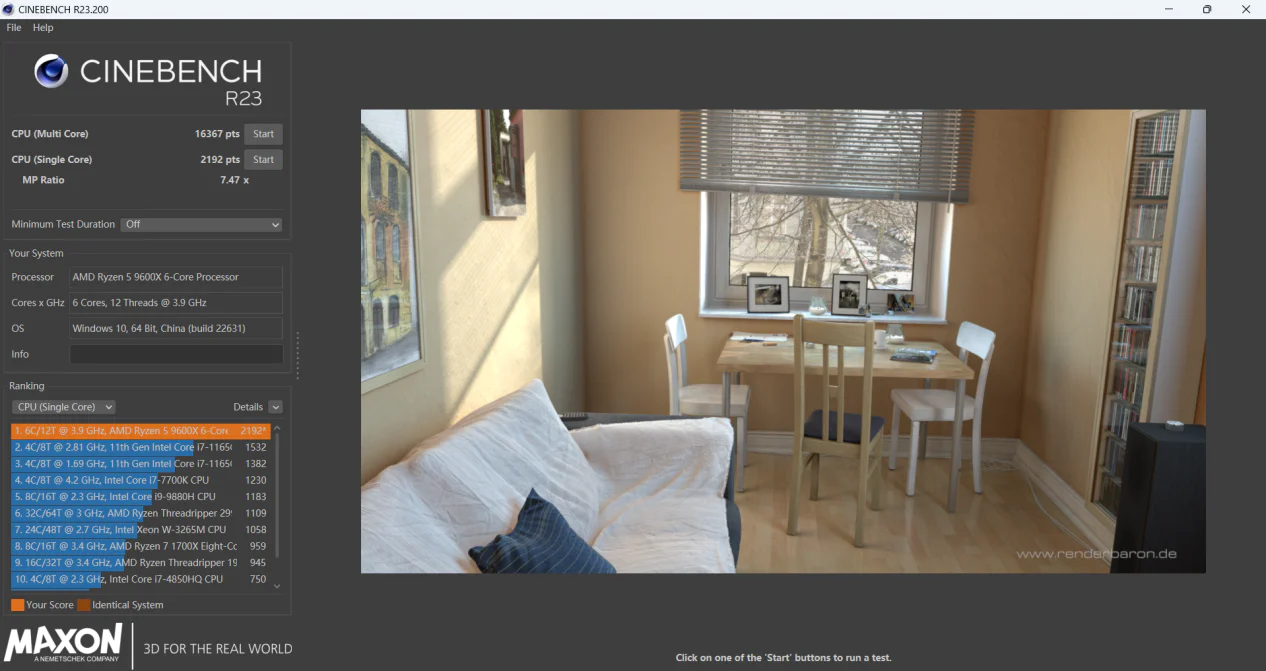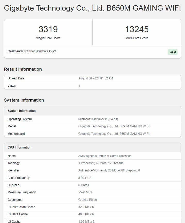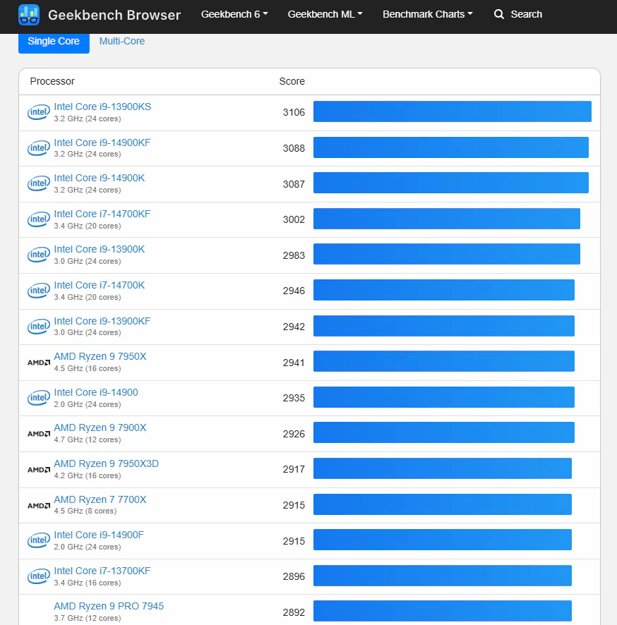Geekbench 6 單核心3319,多核心13245。好奇的我又去看了一下單核心跑分的排行榜,排名第一的i9 13900KS也僅僅只有3109。就單核性能上來講R5 9600X比13900KS強了6%左右。